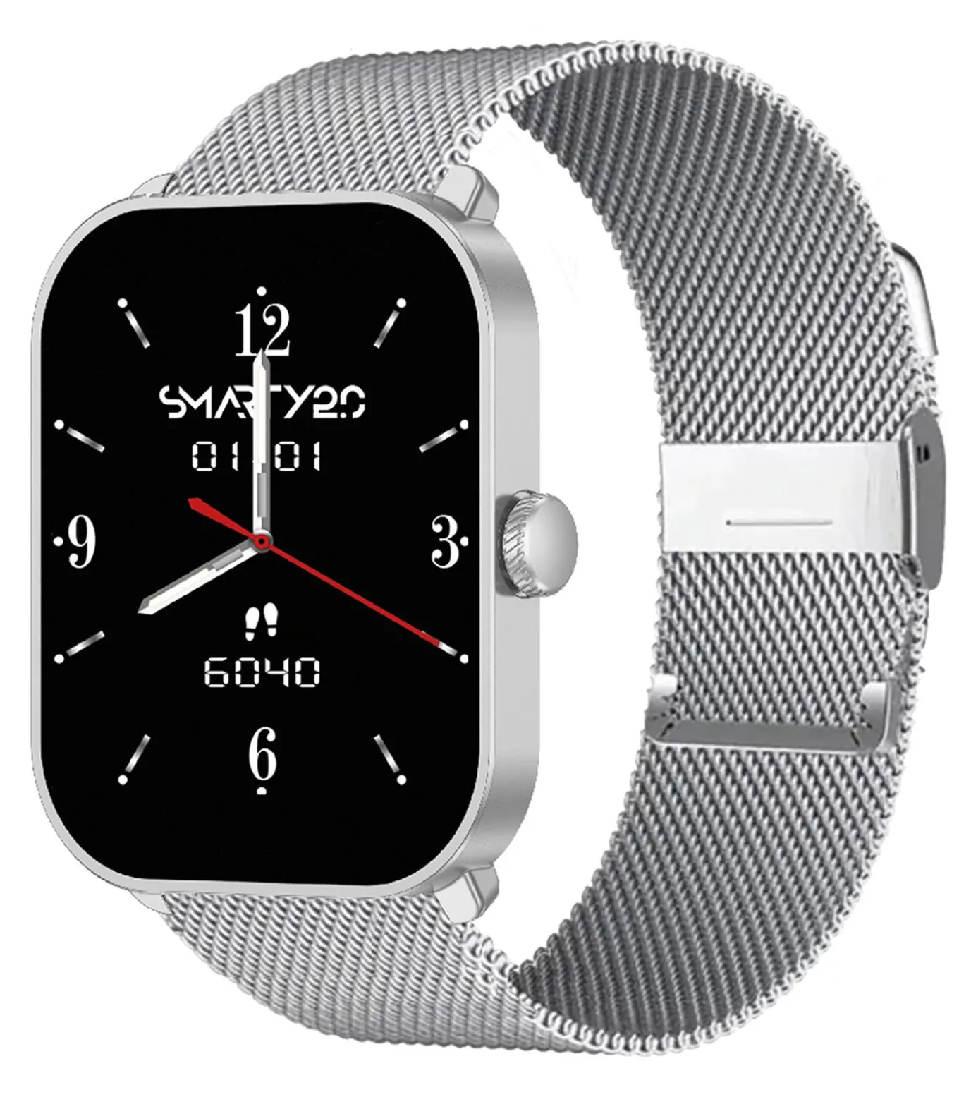 SMARTY2.0 Horloge – Super Amoled – SW070I– Rechthoekige zilverkleurige metalen kast – Zilverkleurige mesh armband – Scherm altijd aan – Bluetooth oproep – Spraakassistent – SOS noodoproep – Schermvergrendeling – +100 sporten – IP68 waterdichtheid: 5ATM – Stand–by tijd van 15 dagen – Compatibel met Android 4.4 / IOS 9 of hoger – Oplader: JA – Bluetooth bereik 10 meter max.