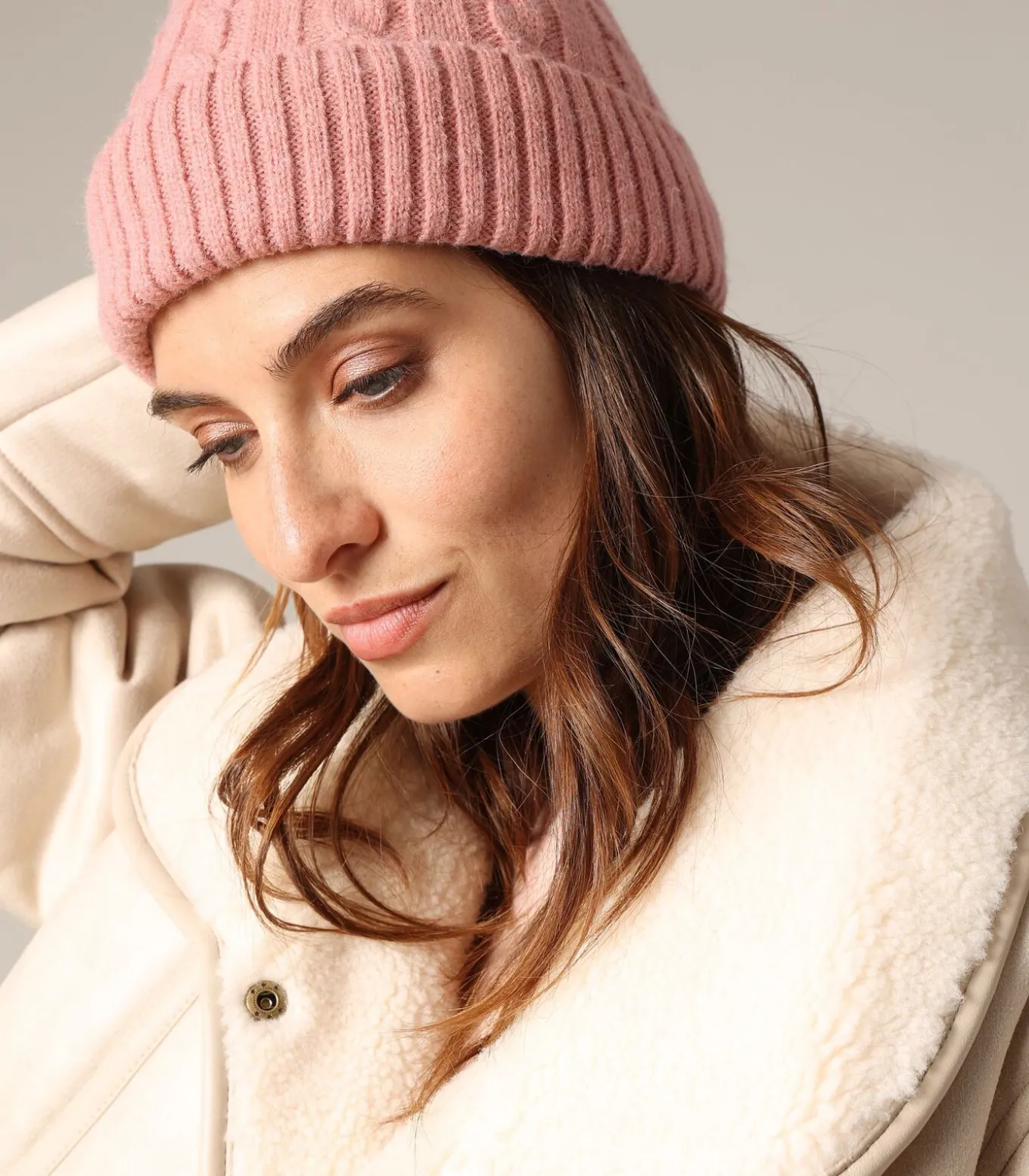 ALPY damesmuts met een warm, winters design. Deze gebreide muts heeft een subtiel, elegant kabelpatroon, versterkt met een brede geribbelde boord voor een comfortabele pasvorm en een gedurfde stijl. De zachte vorm sluit natuurlijk aan op het hoofd en voegt een behaaglijk tintje toe dat perfect is voor het seizoen. Een must–have voor koude dagen, gemakkelijk te combineren met al je winteroutfits.