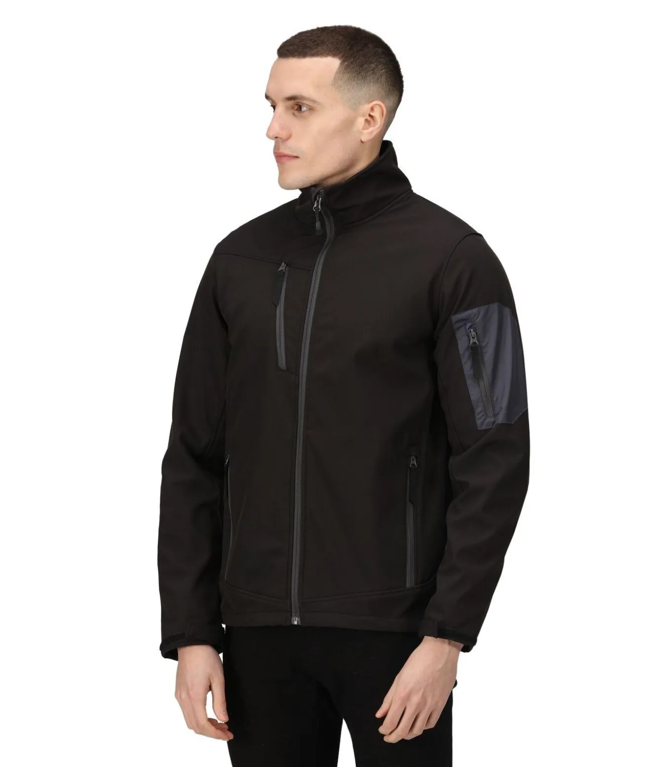 Regatta ARCOLA – Zwarte jasje is gemaakt van 96% polyester en 4% elastane. Het heeft een drielaags softshell weefsel, dat zowel ademend, duurzaam, waterdicht, windbestendig en XPT–technologie bevat. Het ontwerp is eenvoudig en de jasje bestaat uit 300gsm. De manchetten zijn verstelbaar en hebben een hoog nek. Er is ook binnenritsbeveiliging en het heeft lange mouwen. Het is geschikt voor reguliere gebruik en er zijn diverse zakken zoals één borstzak, twee zijzakken en een rit. De volledige rijtssluiting voorkomt verplaatsen en er is een verstelbare zoom met schokkoord. Het product wordt geleverd in een polybag. De grootten die beschikbaar zijn zijn XL (49 inch), XXL (53 inch) en 3XL (56 inch).
