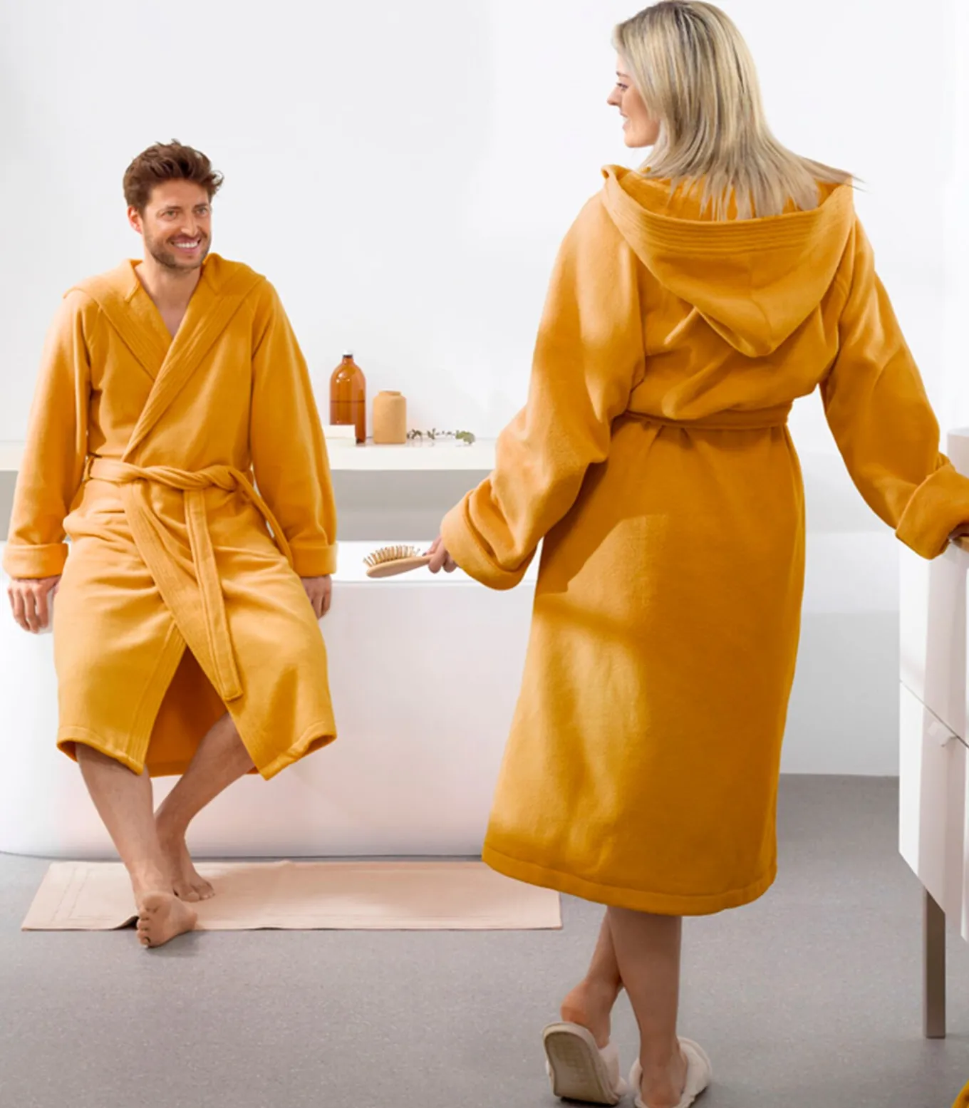 Moodit Badjas Reese, Sunshine geel. Een mooie, uiterst comfortabele, badjas uit de nieuwste badcollectie van Mood!t. Deze badjas heeft een aangename en absorberende binnenkant, gemaakt van badstof. De buitenkant voelt heerlijk zacht aan door het microvezel fluweel materiaal. Na het douchen, badderen of sauna bezoek blijft u dus droog een aangenaam door deze fijne badjas, voorzien van capuchon, steekzakken en een ceintuur. Geschikt voor zowel dames als heren, is deze badjas een geweldige aanvulling op uw dagelijkse bezigheden.