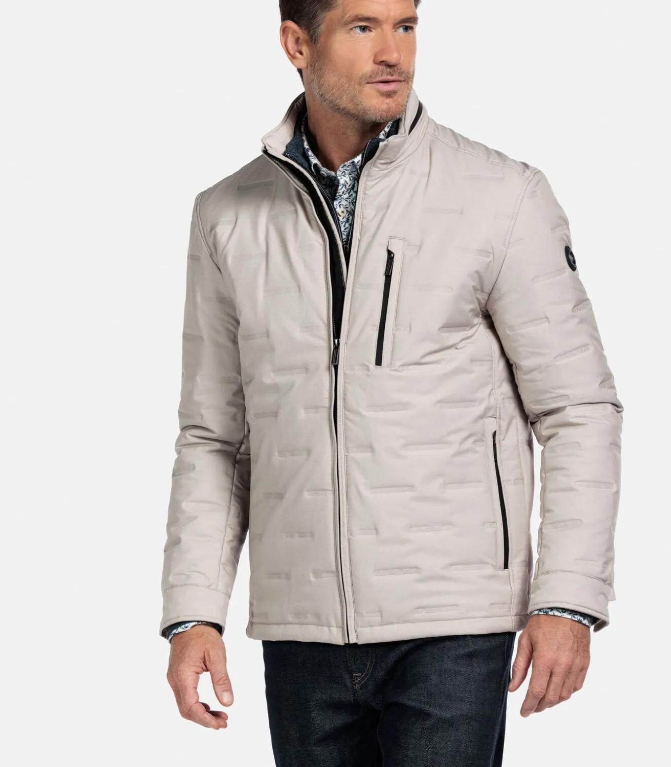 Deze sportieve jas is uitgevoerd in een twill met membraan en een subtiel embossed dessin. Het model heeft een regular fit, opstaande kraag, ritssluiting en zakken met rits in de zijnaden. Binnenin bevindt zich een handige doorvoeropening voor een oordopjes– of oplaadkabel, zodat je apparaten veilig in je binnenzak kunt opbergen. De combinatie van het technische materiaal en de verfijnde afwerking maakt deze jas zowel stijlvol als praktisch. Artikelnummer 522350–81