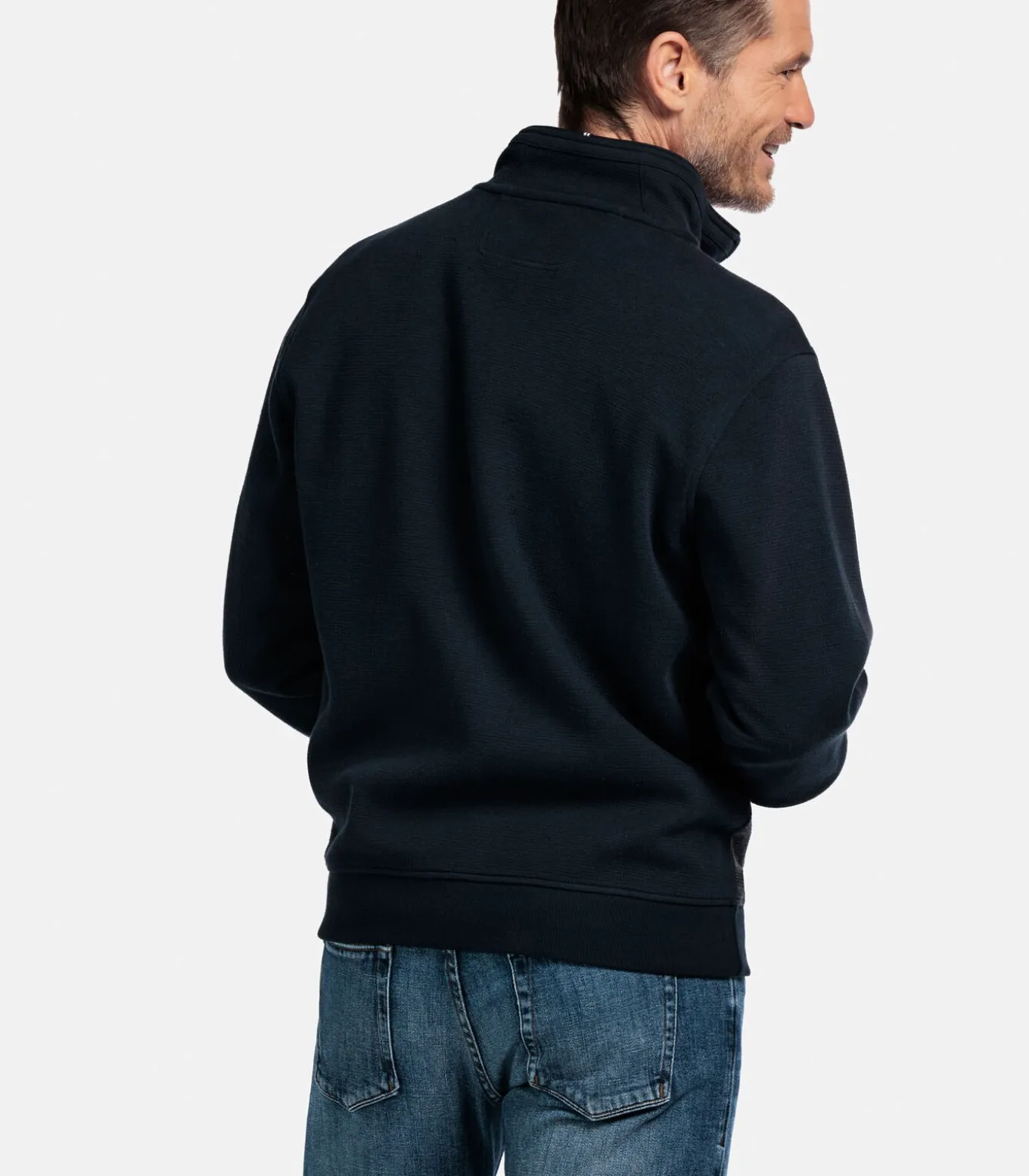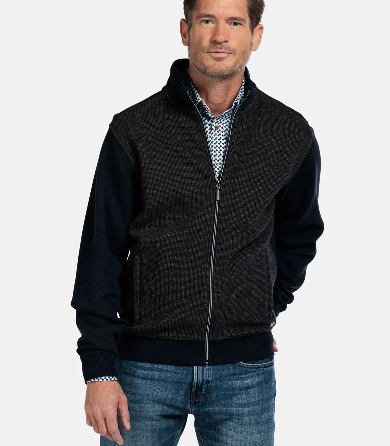 Dit two–tone sweatvest is uitgevoerd in een regular fit en gemaakt van een stevige katoenmix. Het jacquard geweven voorpand geeft het model een bijzondere textuur, terwijl de mouwen en achterkant glad zijn voor een mooi contrast. Afgewerkt met een ritssluiting, zakken met rits en ribgebreide boorden. De combinatie van materialen en structuur geeft dit vest een sportieve, eigentijdse uitstraling.