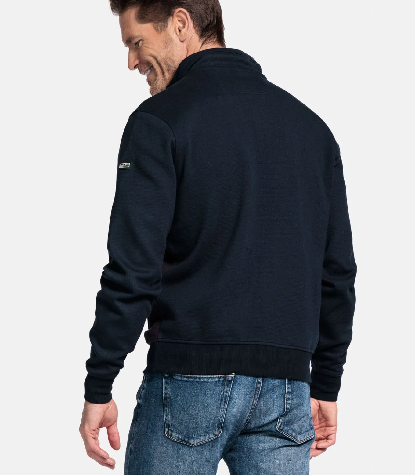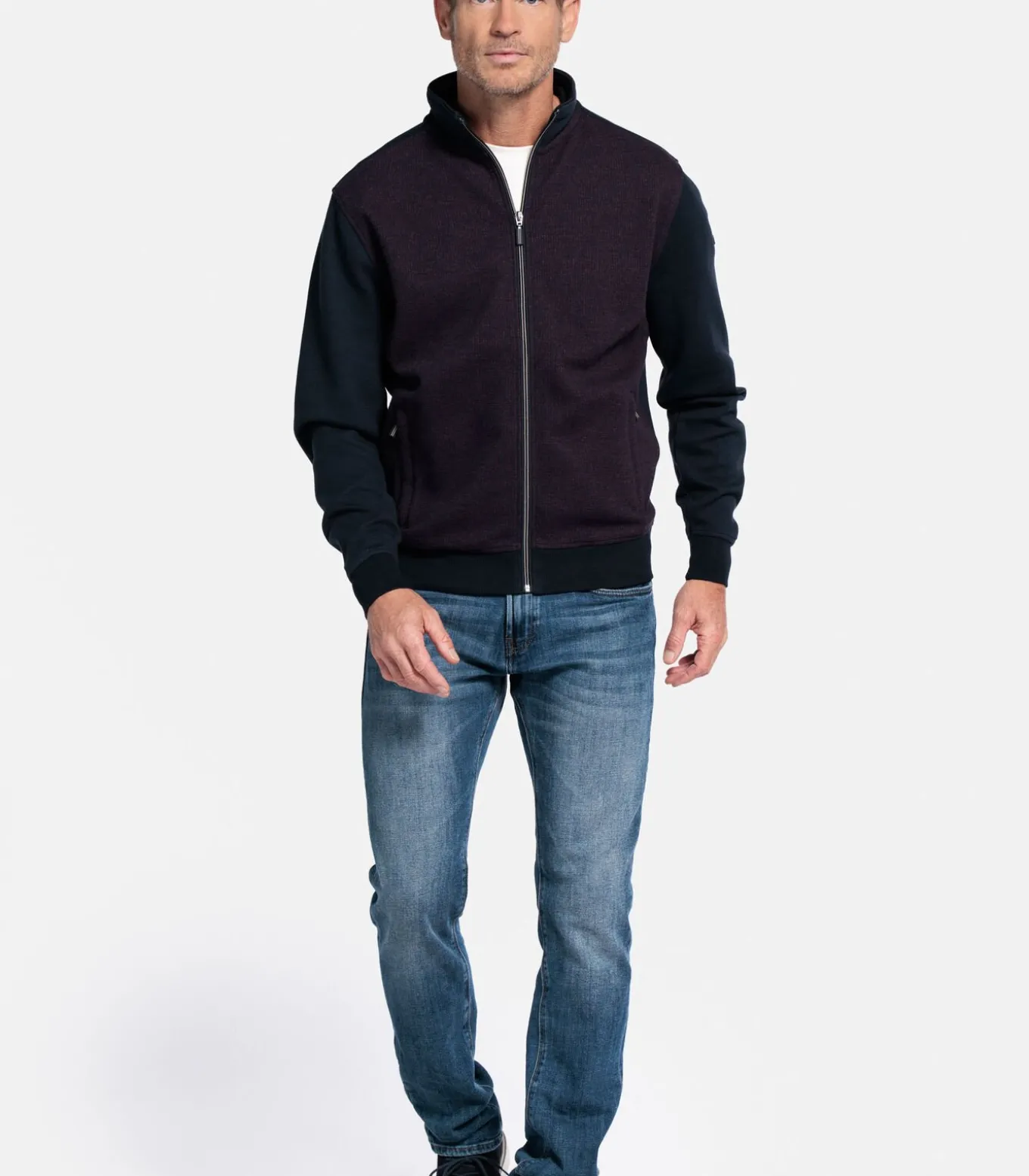 Dit two–tone sweatvest is uitgevoerd in een regular fit en gemaakt van een stevige katoenmix. Het jacquard geweven voorpand geeft het model een bijzondere textuur, terwijl de mouwen en achterkant glad zijn voor een mooi contrast. Afgewerkt met een ritssluiting, zakken met rits en ribgebreide boorden. De combinatie van materialen en structuur geeft dit vest een sportieve, eigentijdse uitstraling. Artikelnummer 522250–40