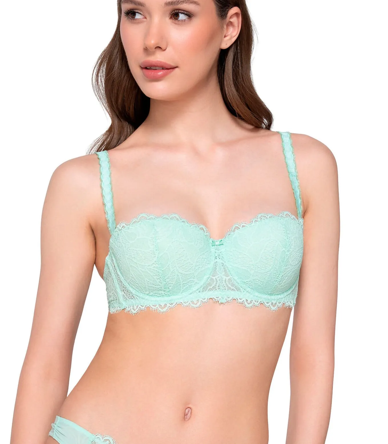Balconette bh gesneden om een prachtig bandeau effect te creëren. De cups zijn versierd met delicaat bloemenkant. De rand onder de buste is versierd met verfijnde schulprandjes die doorlopen op de rug voor een extra romantische touch. De dunne bandjes zijn verstelbaar voor een perfecte pasvorm.
