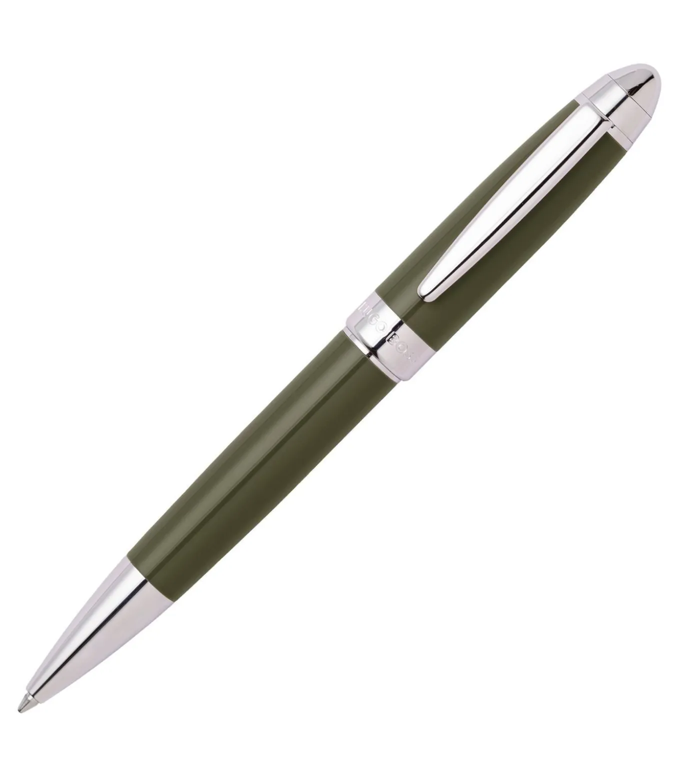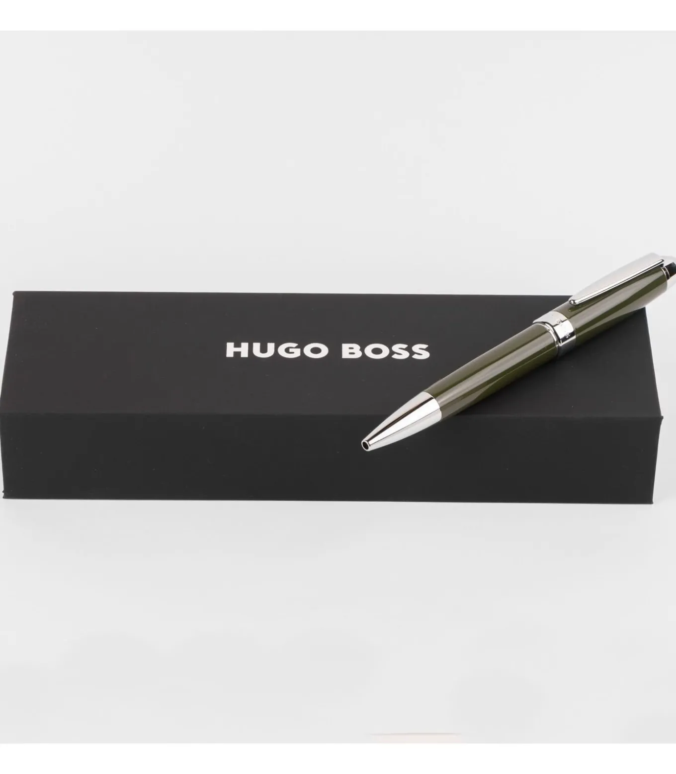 Introducing the HUGO BOSS Ballpoint Pen Icon Kaki/Chrome—a perfect blend of sophistication and functionality. Crafted from high–quality brass with a sleek dark green lacquer finish, this pen exudes elegance in every stroke. Weighing just 46 grams, it feels substantial yet comfortable in your hand, making it ideal for both professional and personal use. With a smooth blue ink cartridge and stylish chrome accents, make a statement with every note you take. Elevate your writing experience with this exquisite accessory that suits everyone—men, women, and anyone in–between. Dimensions: DIA.15/H.138 mm, Material: Brass,Lacquer