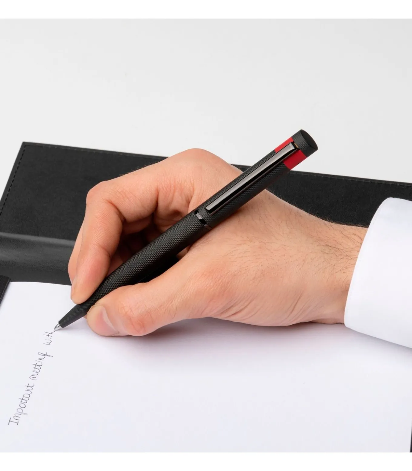 Het silhouet van het lusvormige schrijfinstrument heeft resoluut actieve en moderne ontwerpelementen, die zorgen voor een optimale schrijfervaring. Deze nieuwste versie biedt een mat ruitvormig geslepen patroon gemixt met soft touch gedrukte handtekening voor een grafische en moderne touch en feel. Dimensions: DIA.11.6/H.145 mm, Material: Brass,Black plating