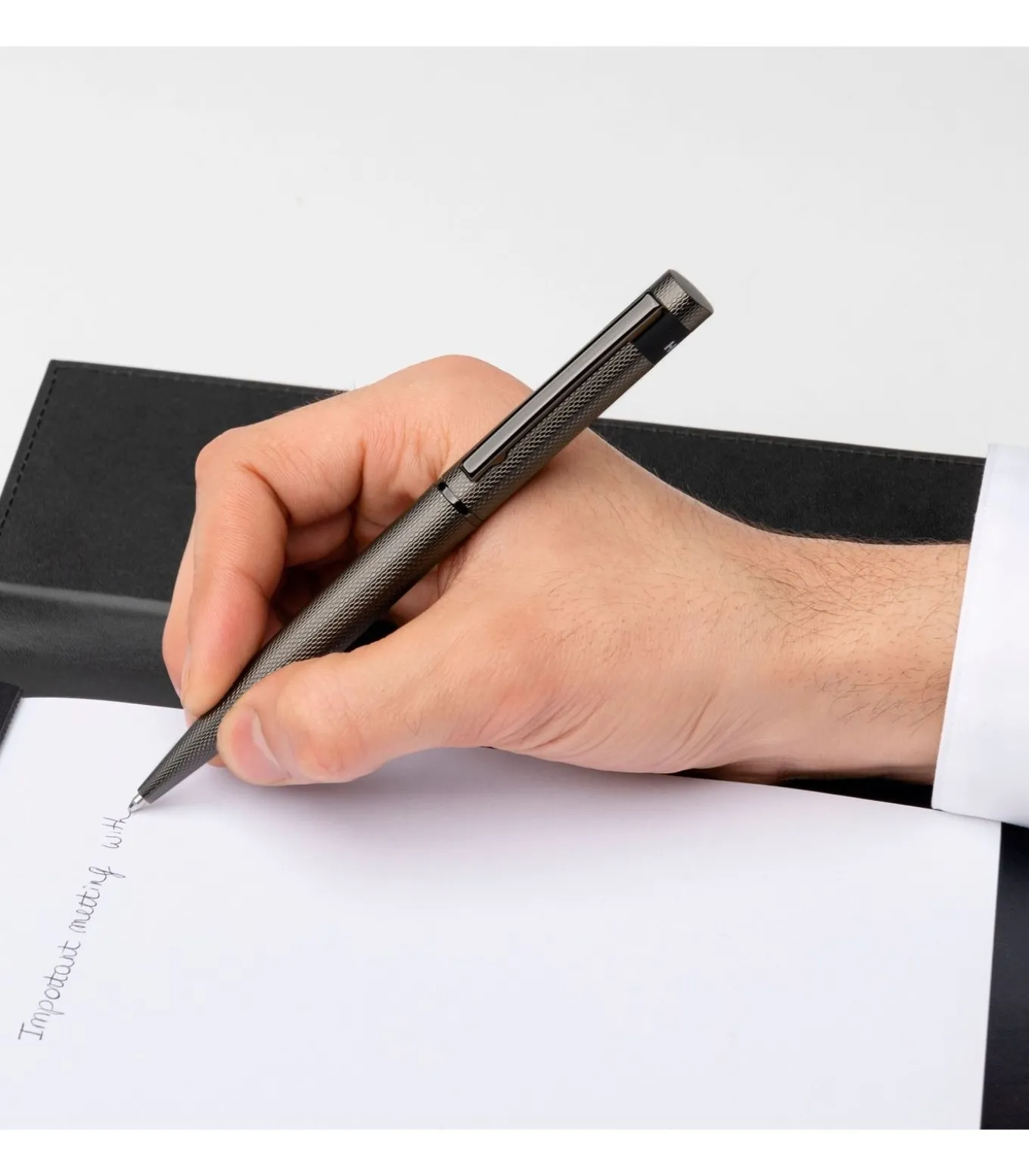 The Loop writing instrument silhouette combines resolutely active and modern design elements, creating an optimal writing experience. This pictured version features a matte diamond–cut pattern mixed with a soft–touch printed surface for a graphical and modern haptic. Dimensions: DIA.11.6/H.145 mm, Material: Brass,Gun plating