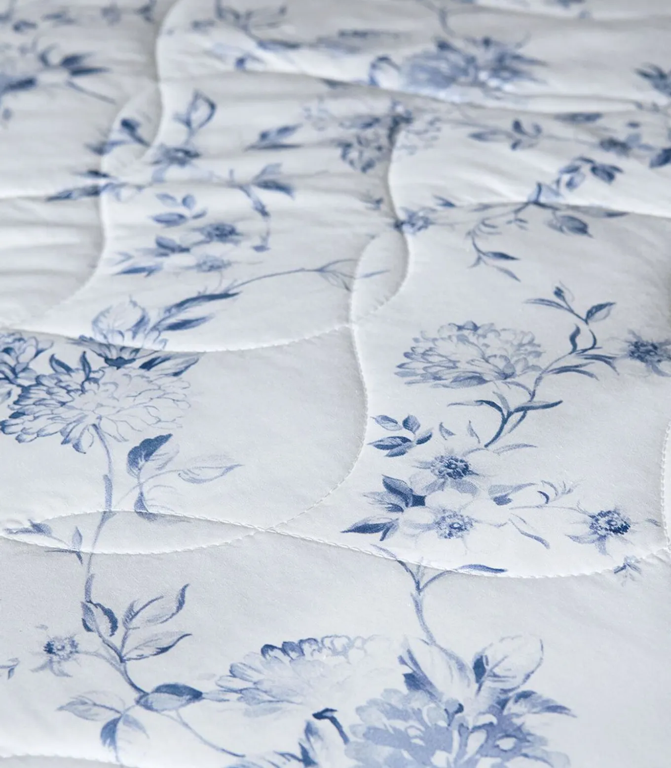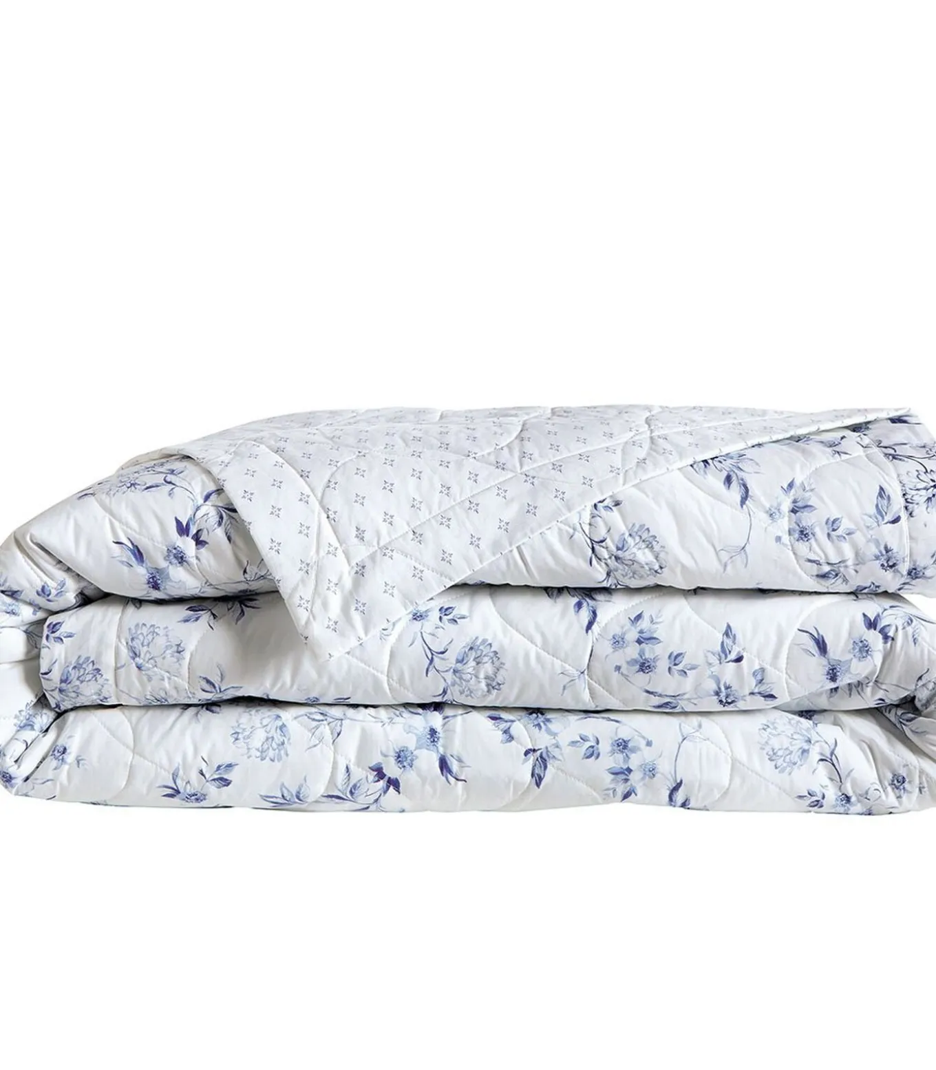 Blauwe bloemenprint op optisch witte achtergrondAchterkant met blauwe faïenceprint op optisch witte achtergrond