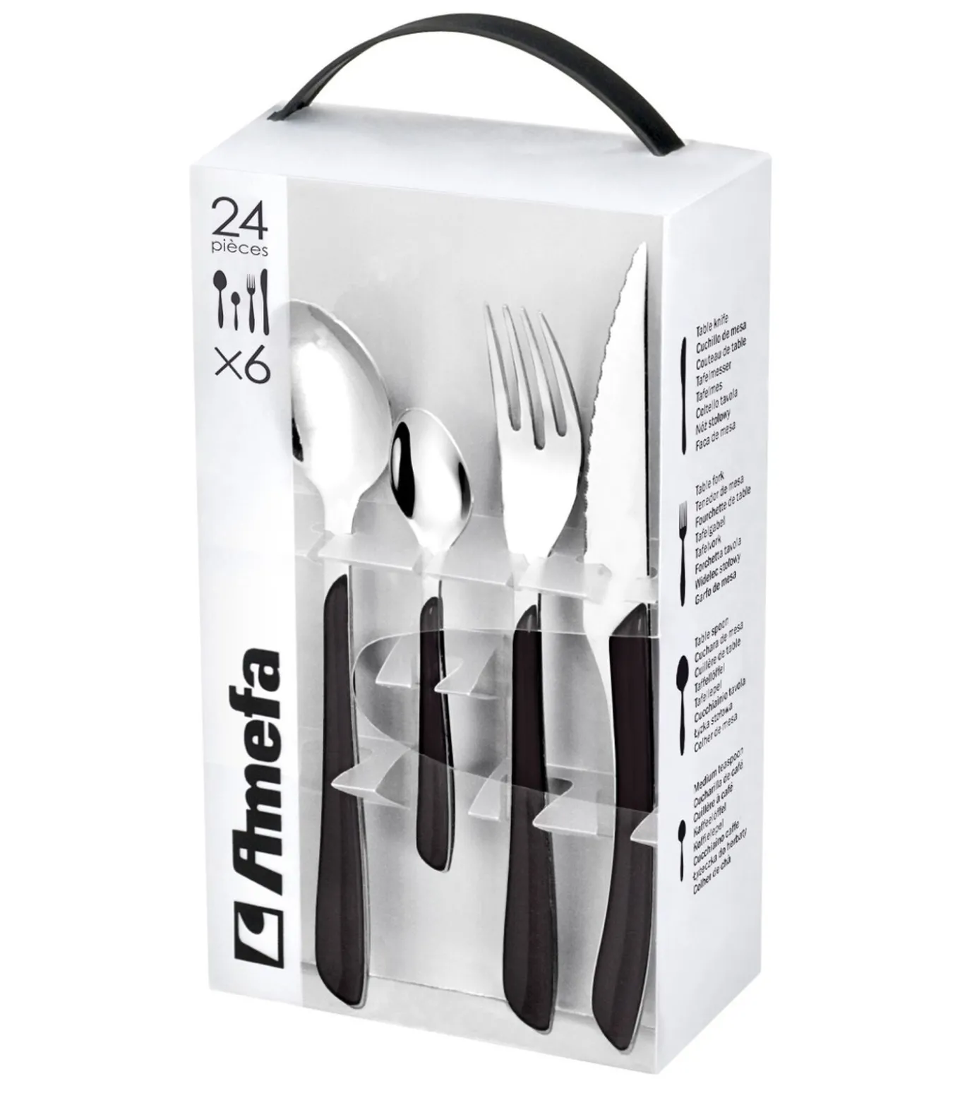 Het bestek 24–delig is onderdeel van de productlijn Eclat van het merk Amefa. Eclat bestek heeft een heldere en diepe kleur. Het bestek heeft een moderne en eigentijdse uitstraling en geeft je tafel kleur. Het bestek 24–delig van Eclat is gemaakt van hoogwaarding 18/0 RVS en kunststof, en heeft een dikte van 2 milimeter. Kwaliteit staat bij Amefa hoog in het vaandel. 18/0 betekent 18% chroom en geen aandeel nikkel. Dit zorgt voor een hoge corrosie bestendigheid. Producten gemaakt van 18/0 staal kunnen gereinigd worden in de vaatwasmachine. Aangeraden wordt wel om direct na het eindigen van het programma het bestek droog te wrijven met een zachte doek. Mist u nog iets in uw bestekset? Bekijk dan de volledige collectie van Amefa Eclat. Ook voor ander bestek van Amefa bent u bij ons aan het juiste adres. Bekijk onze gehele Amefa collectie!