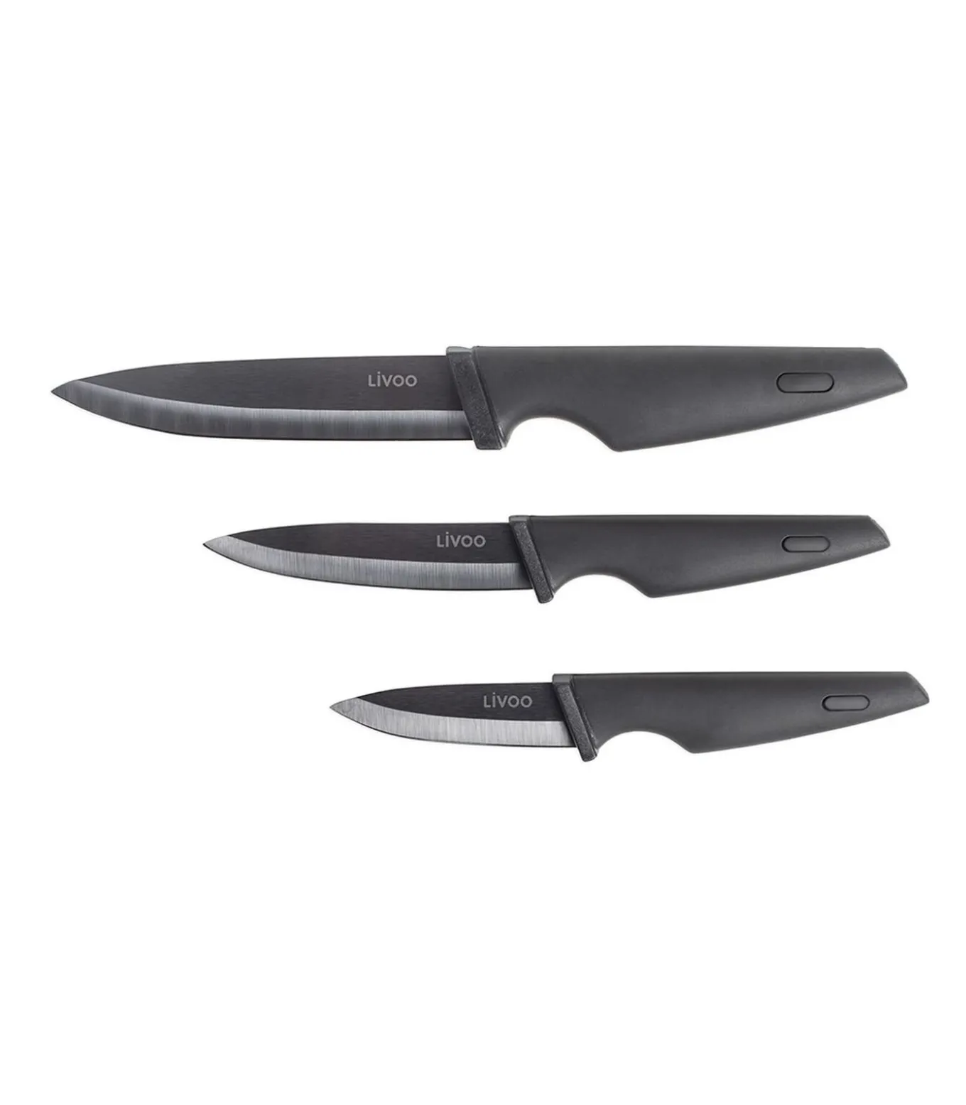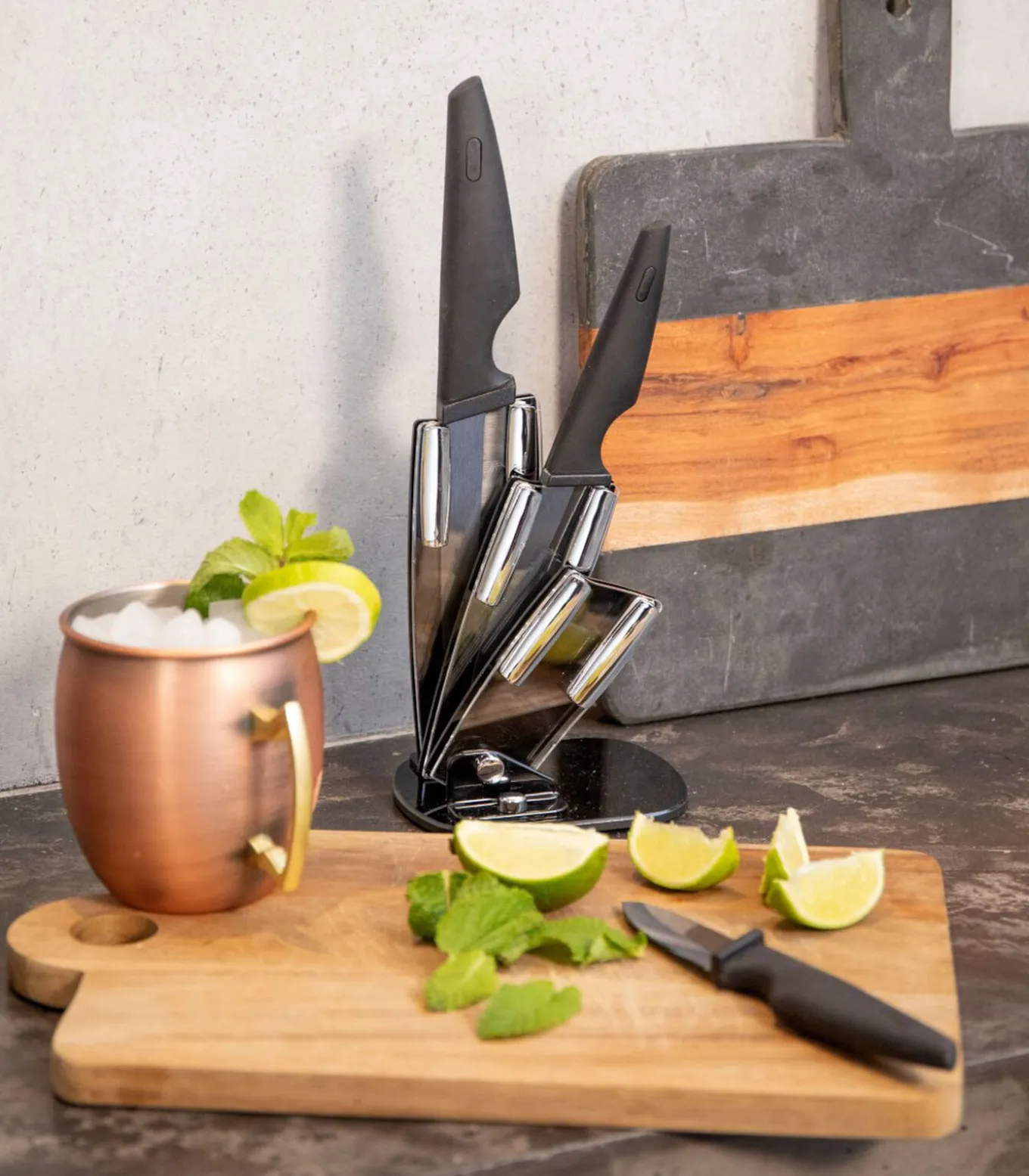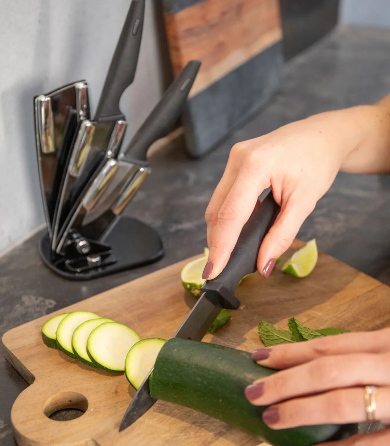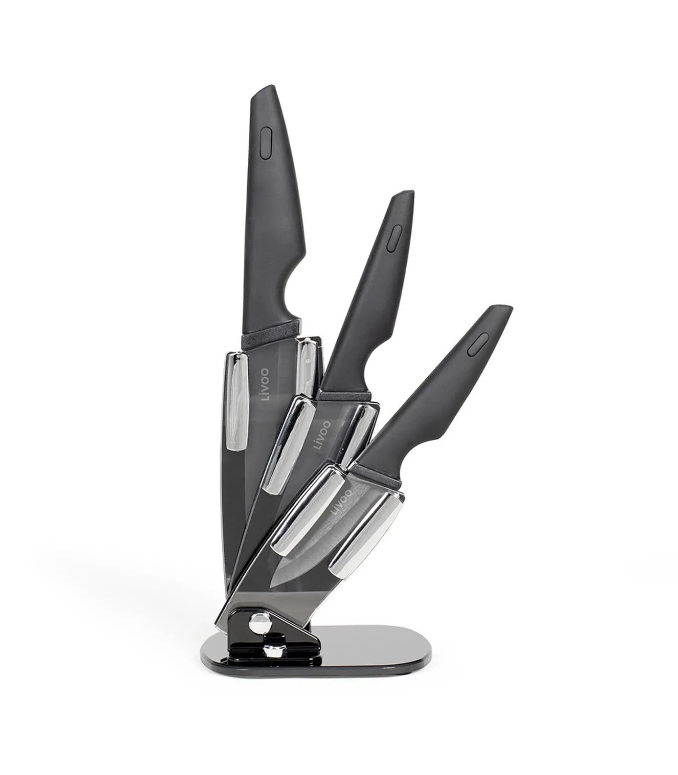 3 messen van 7,5 cm, 10 cm en 12,5 cm, Keramisch lemmet, Zacht handvat, Ergonomisch ontworpen voor een goede grip, Geïntegreerde steun om het lemmet horizontaal te houden, Designblok van acryl, Vaatwasmachinebestendige messen