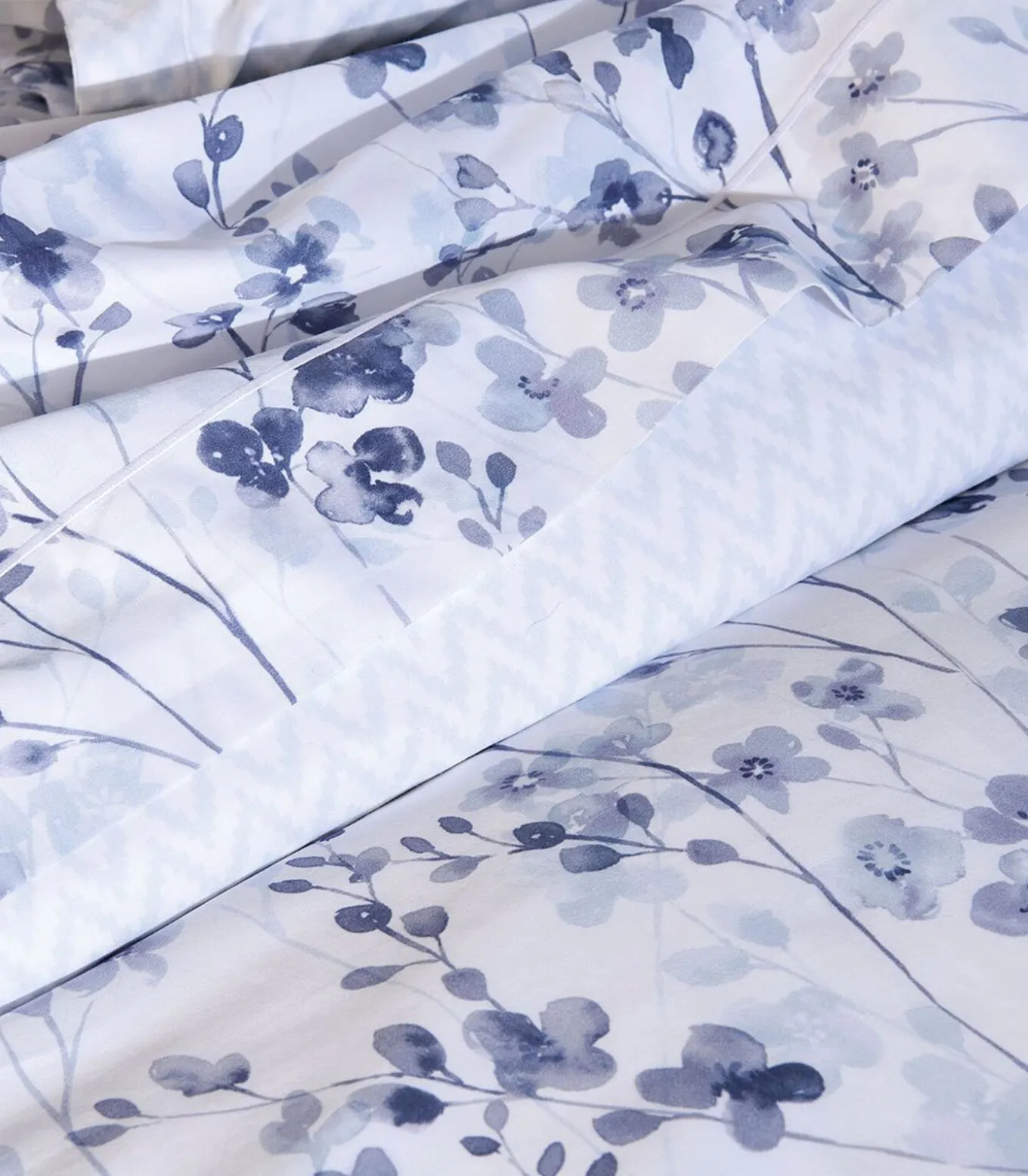 Je verbeelding wiegen op het natuurlijke ritme van het winterlicht. Een blauwige aquarel van kweepeerbloemen sluit aan bij een visgraatmotief en roept een zachte en serene sfeer op