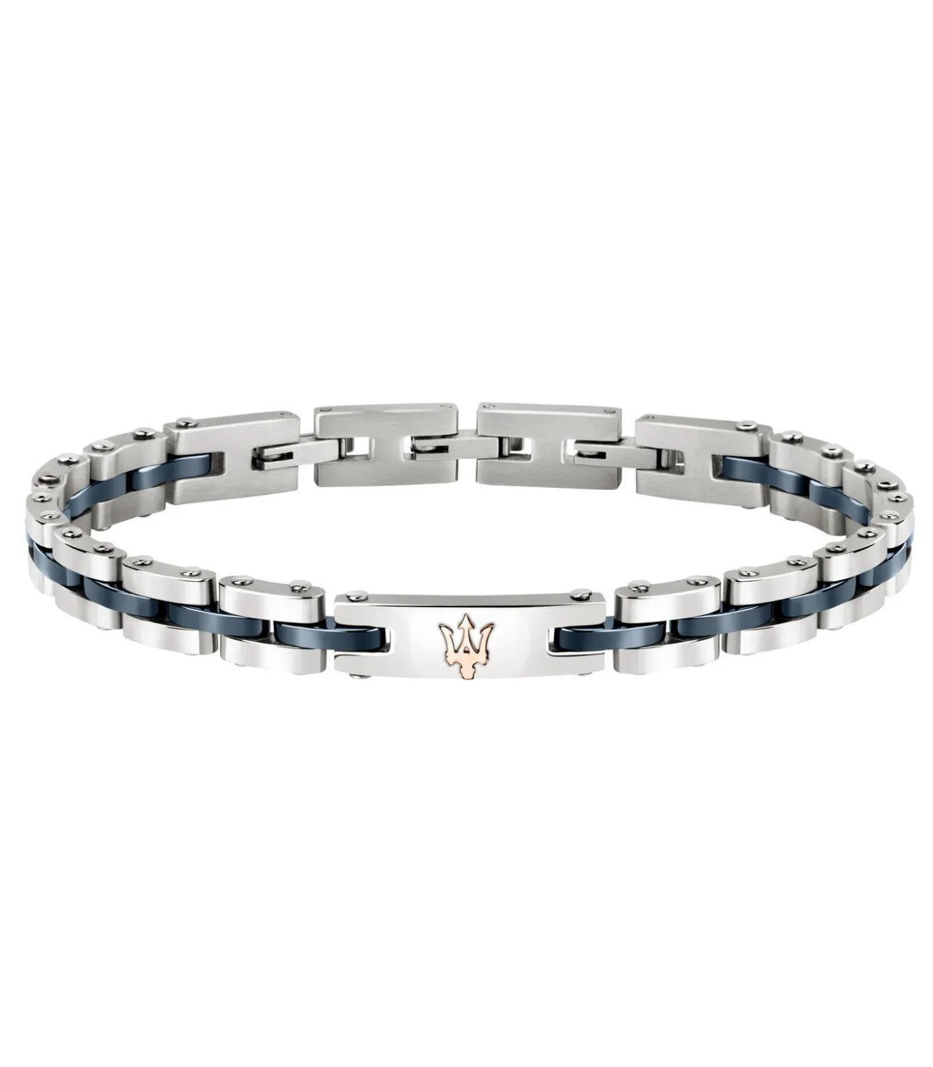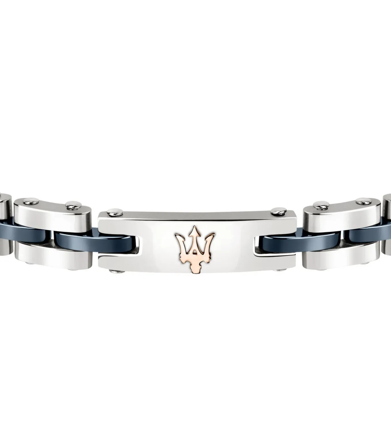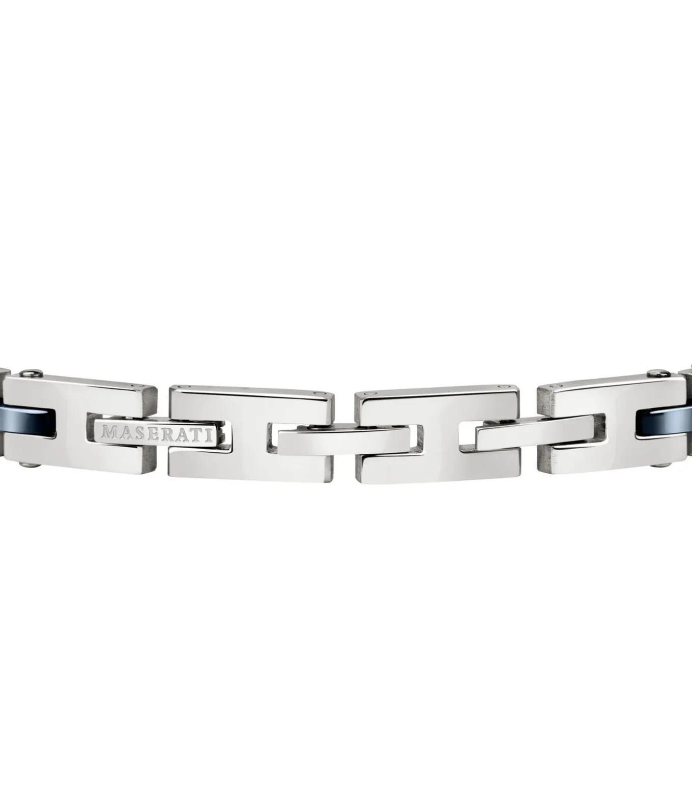 Maserati herenarmband, Jewels Collectie, ref. JM220ASR08, lengte 20,9 cm. De armband is voorzien van een praktische clipsluiting. Maserati Jewels: modellen die sportiviteit en elegantie combineren dankzij moderne constructies en eigentijdse chromatische afwerkingen. Armbanden met ad hoc ontworpen schakels met 3D–effecten, gemaakt van staal en keramiek, worden afgewisseld met voorstellen in geweven leer met stalen details.