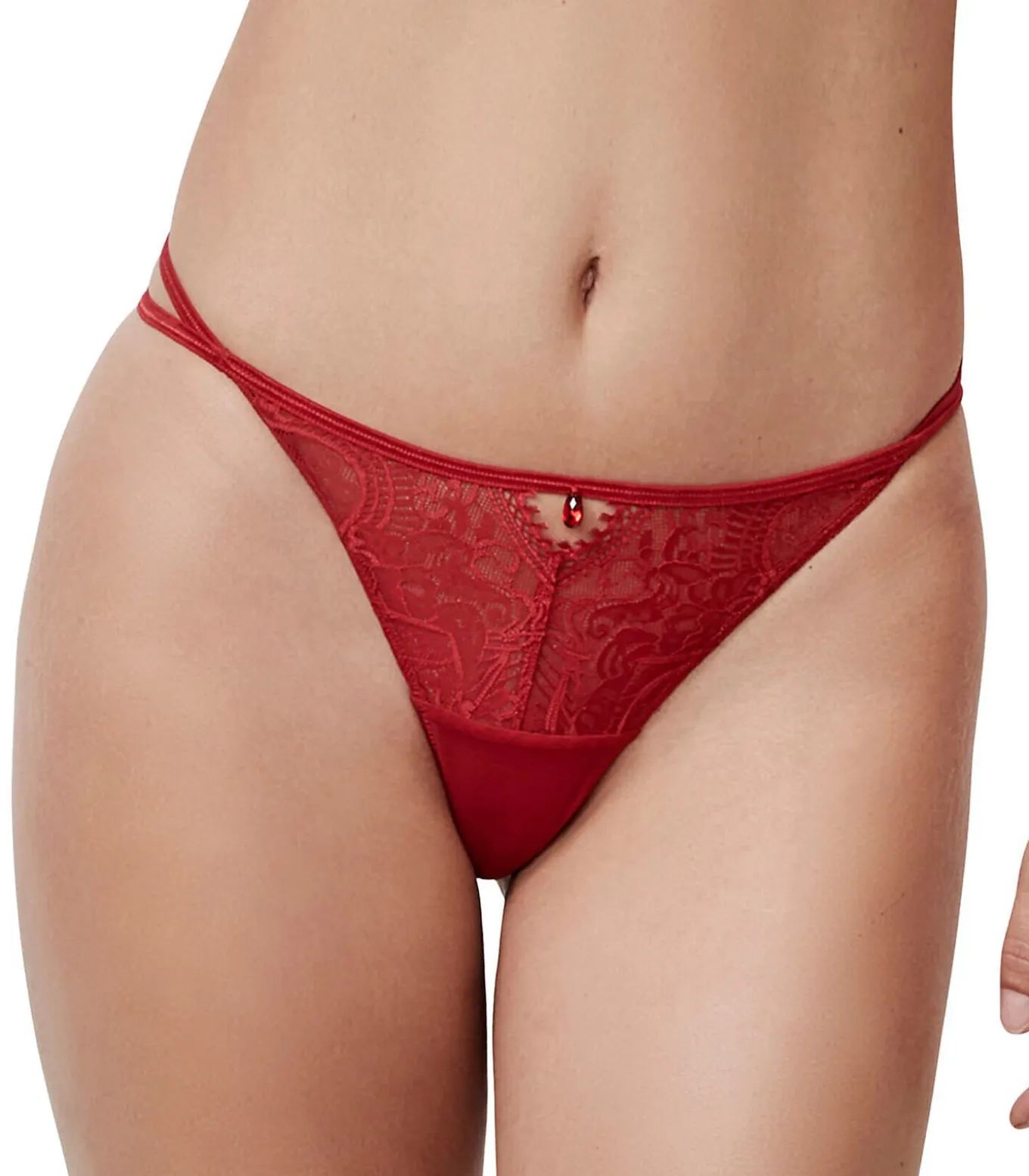 Braziliaans van fijn kant met bloemen– en arabeskmotieven voor een delicaat, sensueel effect. De lage taille is aan de voorkant versierd met een klein glanzend juweel dat in het midden van de tailleband is genaaid en een verleidelijke touch toevoegt. De tailleband is dun aan de zijkanten met een dubbele band die een effect van elegante, minimalistische lijnen creëert. De snit aan de achterkant benadrukt je billen, in een gedurfde, verfijnde stijl die de essentie van glamour en verfijning weergeeft. Afgewerkt op de rug met een fijne, sierlijke picot vlecht voor een delicate touch. Katoenen kruisje voor gegarandeerd intiem comfort. Klein goudkleurig logo op de achterkant.