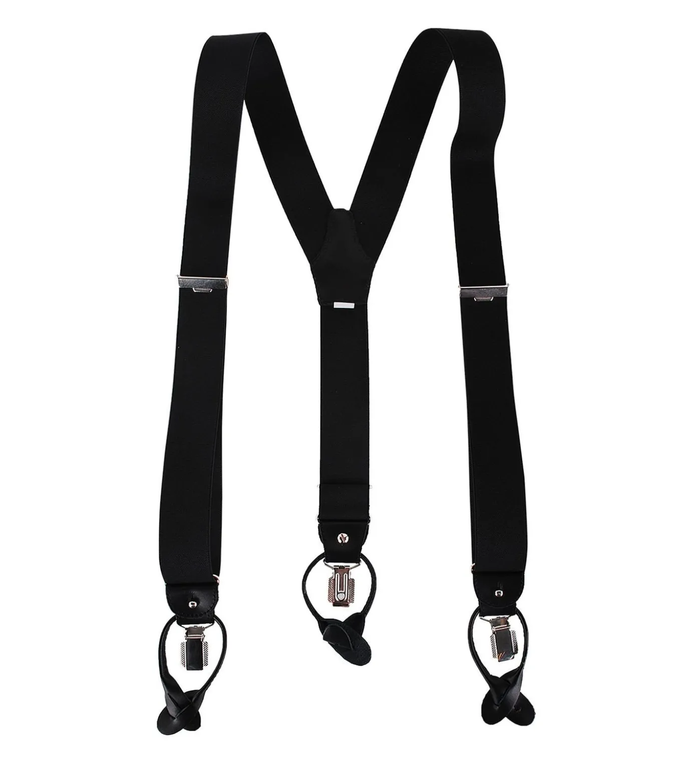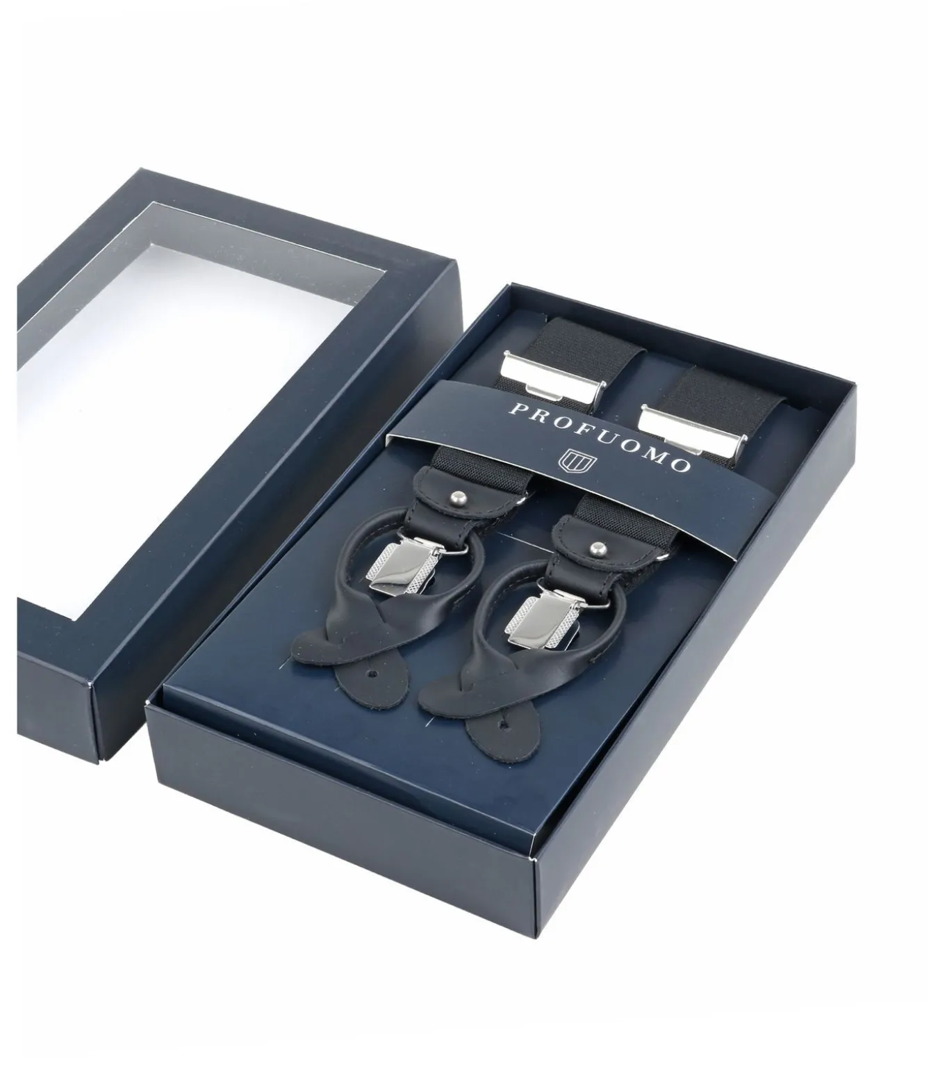 Luxe bretels van het Nederlandse merk Profuomo. De bretels hebben zowel leertjes (patten) als klemsluitingen, deze kun je verwijderen zodat je de bevestiging naar keuze kunt dragen. De bretels worden geleverd inclusief bijpassende bretelknopen die je aan je broek kunt bevestigen. De bretels zijn gemaakt van 85% Polyester gemixt met 15% Elasthaan. Profuomo Y–vorm bretelsZwart van kleurBreedte: 3,5 cm Lussen met knoopsgat + klemsluitingBretels worden geleverd in een luxe verpakking