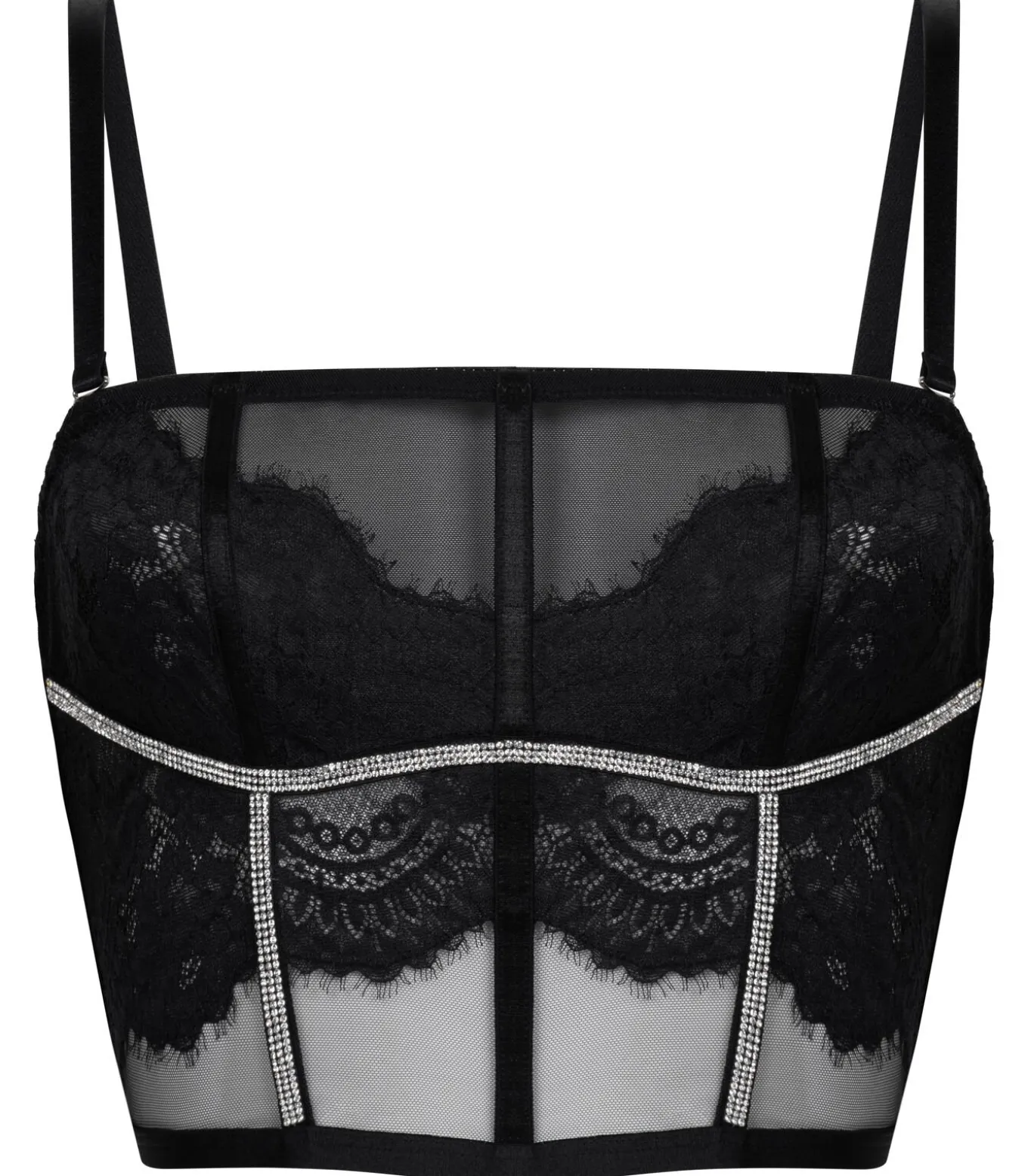 Maak een statement met deze oogverblindende bustier. Hij is ontworpen met mesh en kanten panelen en voorzien van glitters die het licht vangen bij elke beweging. De niet–voorgevormde cups zorgen voor een natuurlijk silhouet, terwijl de gestructureerde pasvorm zachtjes vormt en ondersteunt. Combineer hem met het bijpassende broekje voor een complete look.