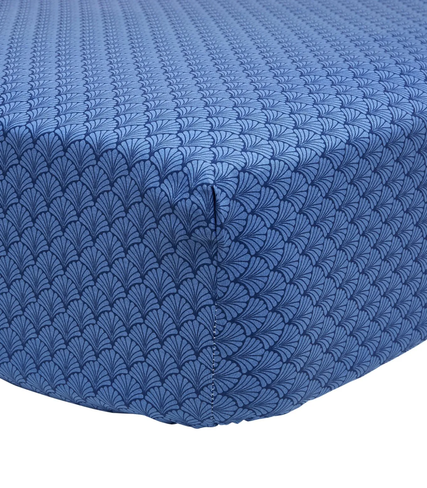 Het hoeslaken is bedrukt in een motief met ‘schubben’ (in dezelfde kleur als de keerzijde van het dekbedovertrek) en heeft een omslag met een hoogte van 24 centimeter.