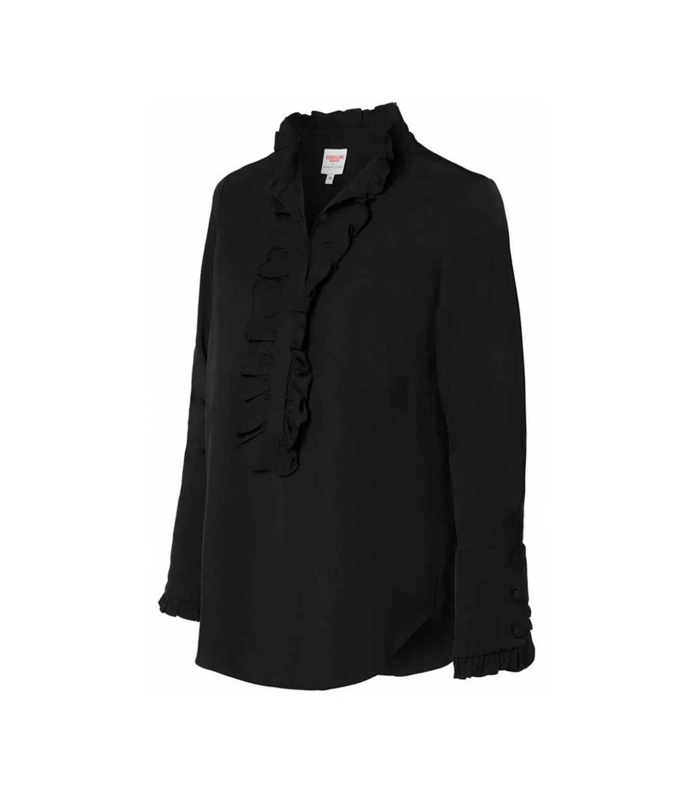 Deze zwarte blouse uit mijn collectie is een tijdloos item dat op subtiele wijze vrouwelijkheid en elegantie samenbrengt. Gemaakt van 100% viscose valt de blouse soepel langs het lichaam en voelt de zachte, non–stretch stof prettig aan op de huid. De licht getailleerde pasvorm accentueert het silhouet zonder in te boeten aan bewegingsvrijheid, waardoor je je de hele dag comfortabel en zelfverzekerd voelt. Een opvallend detail is de opstaande kraag, afgewerkt met verfijnde ruches langs de halslijn, manchetten en knoopsluiting. Deze sierlijke accenten geven de Rivers blouse een elegante twist en maken haar tot een stijlvol alternatief voor een basic zwarte top. De lange mouwen en klassieke knoopsluiting maken de blouse geschikt voor uiteenlopende gelegenheden. Of je nu een representatieve outfit zoekt voor op kantoor of een vrouwelijke look voor een diner, de zwarte Rivers blouse past zich moeiteloos aan jouw stijl aan.
