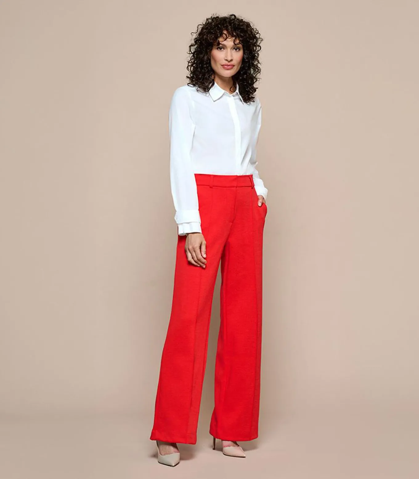 Voeg kleur en elegantie toe aan je garderobe met de Celia pantalon in koraalrood van Mart Visser. Deze eigentijdse damespantalon combineert een krachtige uitstraling met maximaal draagcomfort, waardoor hij geschikt is voor elke gelegenheid, van zakelijke afspraken tot een casual weekendlook. De levendige koraaltint maakt van deze broek een echte eyecatcher, terwijl de rechte pijpen en subtiele pintuck aan de voorkant zorgen voor een slank en gestroomlijnd silhouet. De aansluitende pasvorm op de heupen benadrukt de vrouwelijke vormen, terwijl de iets lossere snit vanaf de knie zorgt voor een flatterend geheel. De lichtgewicht, soepele stof met een vleugje stretch beweegt mee met het lichaam en biedt de hele dag comfort. De elastische tailleband aan de achterzijde garandeert een perfecte pasvorm zonder afbreuk te doen aan stijl. Functionele schuine steekzakken maken het ontwerp compleet en geven een praktische, moderne touch.
