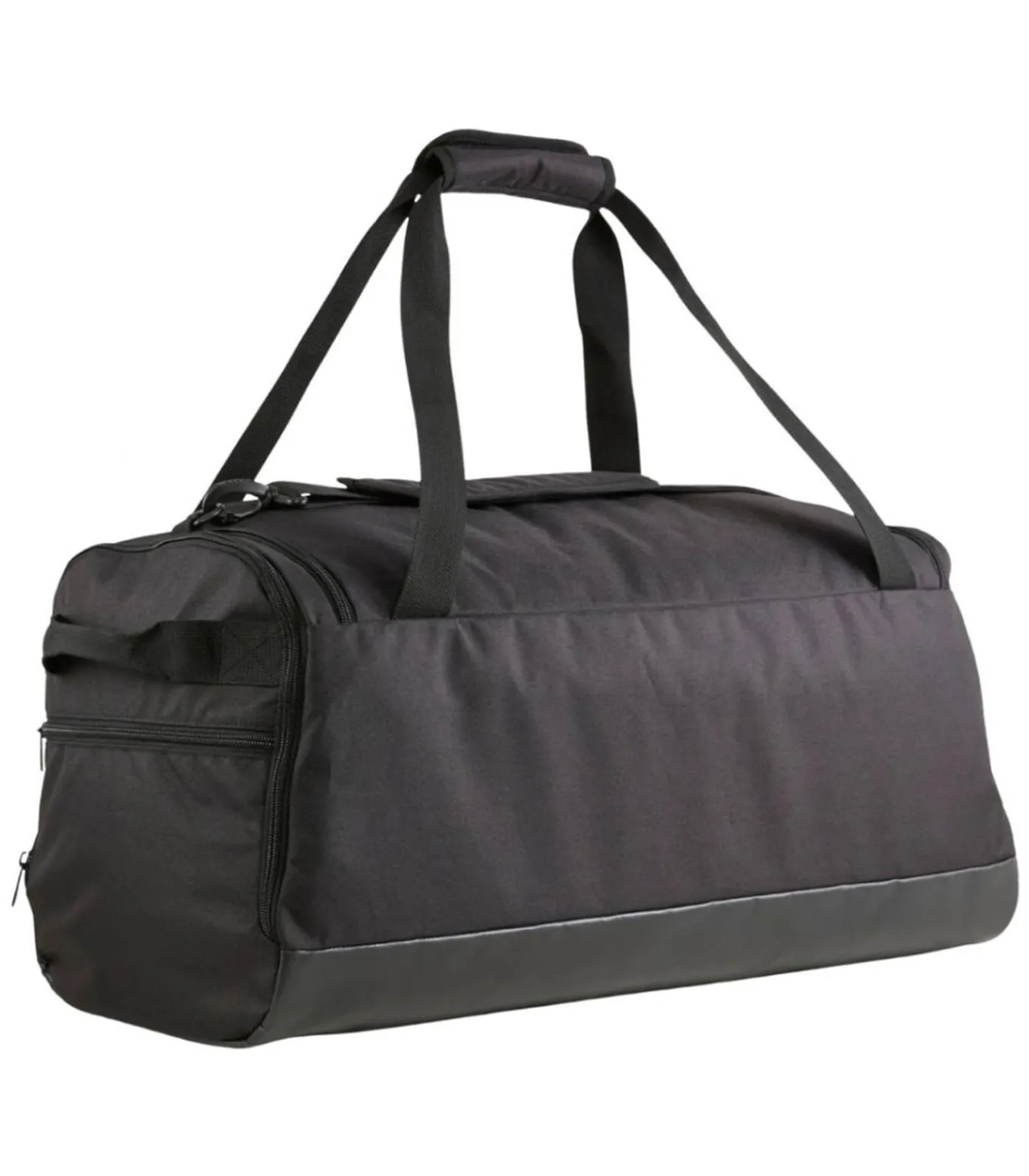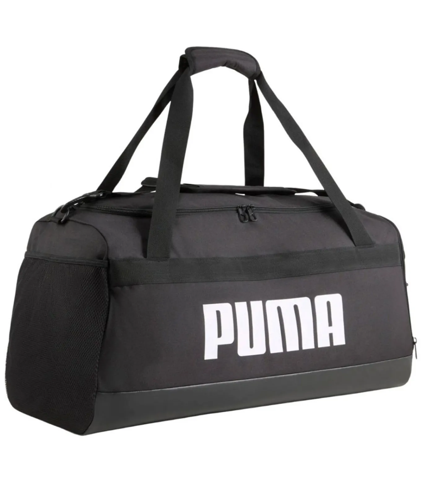 Puma’s zwarte Challenger–plunjezak is gemaakt van 100% polyester en telt een lengte van 62 cm, een hoogte van 31 cm en een breedte van 29 cm. De zak heeft onder meer verstelbare schouderriem, handvat, klittenband en gevoerde bodem. Verder bevat deze plunjezak PU–inzetstukken, schoenenvak en soft touch. De zak wordt vastgehouden door een tweewegrits. Het ontwerp is contrastlogogeborduurd en glad. Deze zwarte plunjezak biedt één hoofdcompartiment en drie zakken: zijzak, rijssluiting en meshzak. De inhoud bedraagt 58 liter en de zak is gemaakt van hergebruikt materiaal.