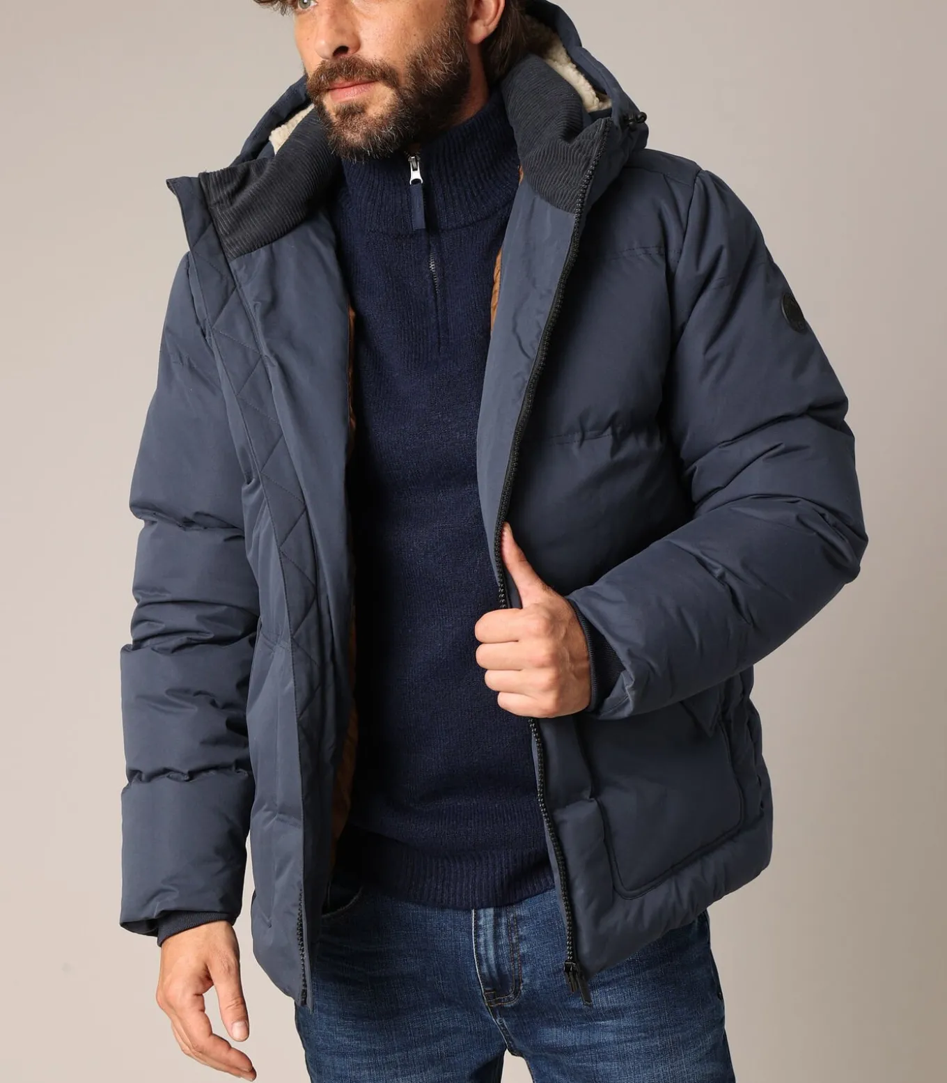 CHICAGO heren donsjack met een casual, urban look. Volledig gewatteerd, biedt het optimaal thermisch comfort en ideale bescherming in de winter. Het rechte model heeft een geïntegreerde gewatteerde capuchon, een opstaande kraag en een ritssluiting aan de voorkant. Twee grote schuine opgestikte zakken met klep benadrukken de functionaliteit van dit model. De manchetten zijn licht aangesnoerd met ribboord aan de binnenkant voor betere isolatie. Het strakke design en matte materiaal geven het een moderne, ingetogen stijl.