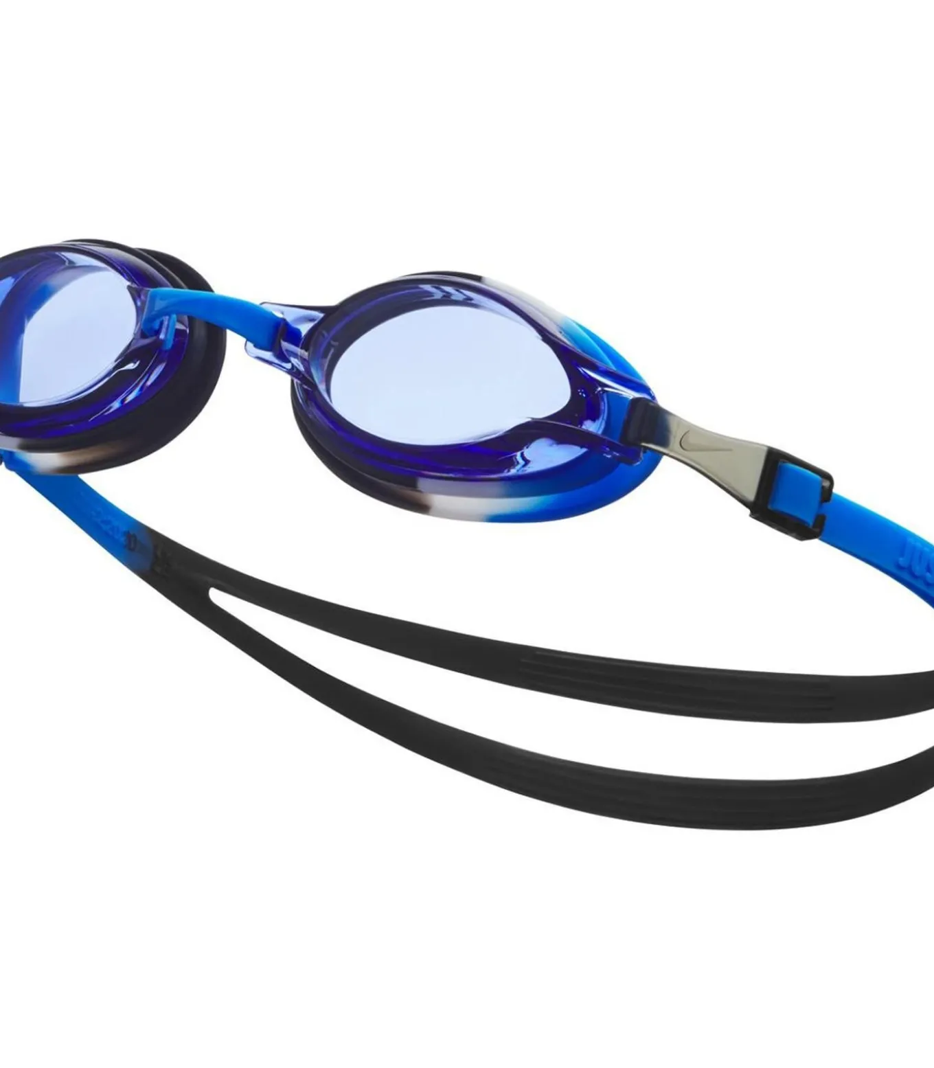 Nike zwembril Chromatik – Lichtblauw: Deze schone zwembril van de merk Nike is ontworpen met een stijlvolle combinatie van chroom, Swoosh–embleem en tekst. De bril kan in zes richtingen worden verbogen, inclusief een verbare neusbrug, anti–condensatie en een silicone hoofdband. Verder beschikt deze zwembril over splitband en UV–bescherming. Deze zwembril is geschikt voor kinderen van 8 tot 14 jaar.