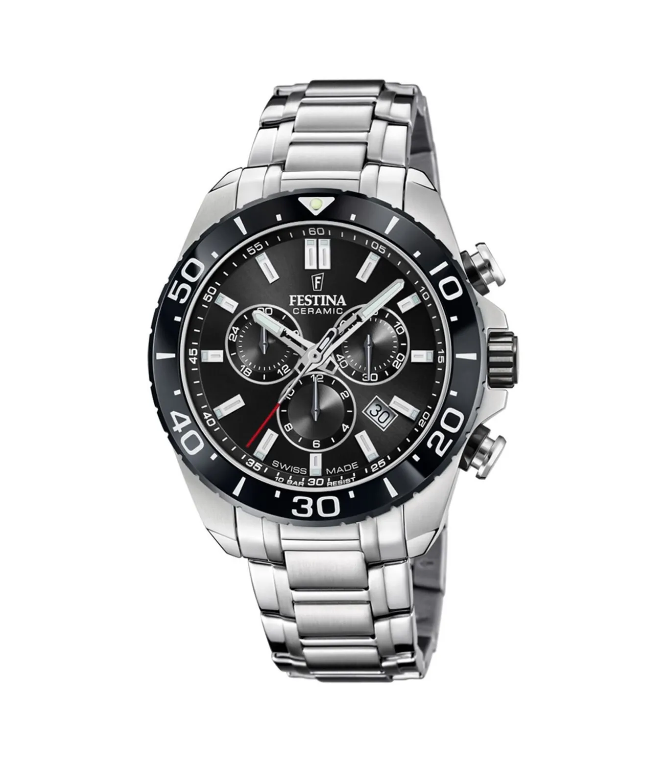 Festina Swiss Made heren horloge met een keramisch staal kast en een saffier glas met een 316l roestvrij staal band/armband. Dimensions: DIA.44/STRAP:0 mm, Material: Stainless steel