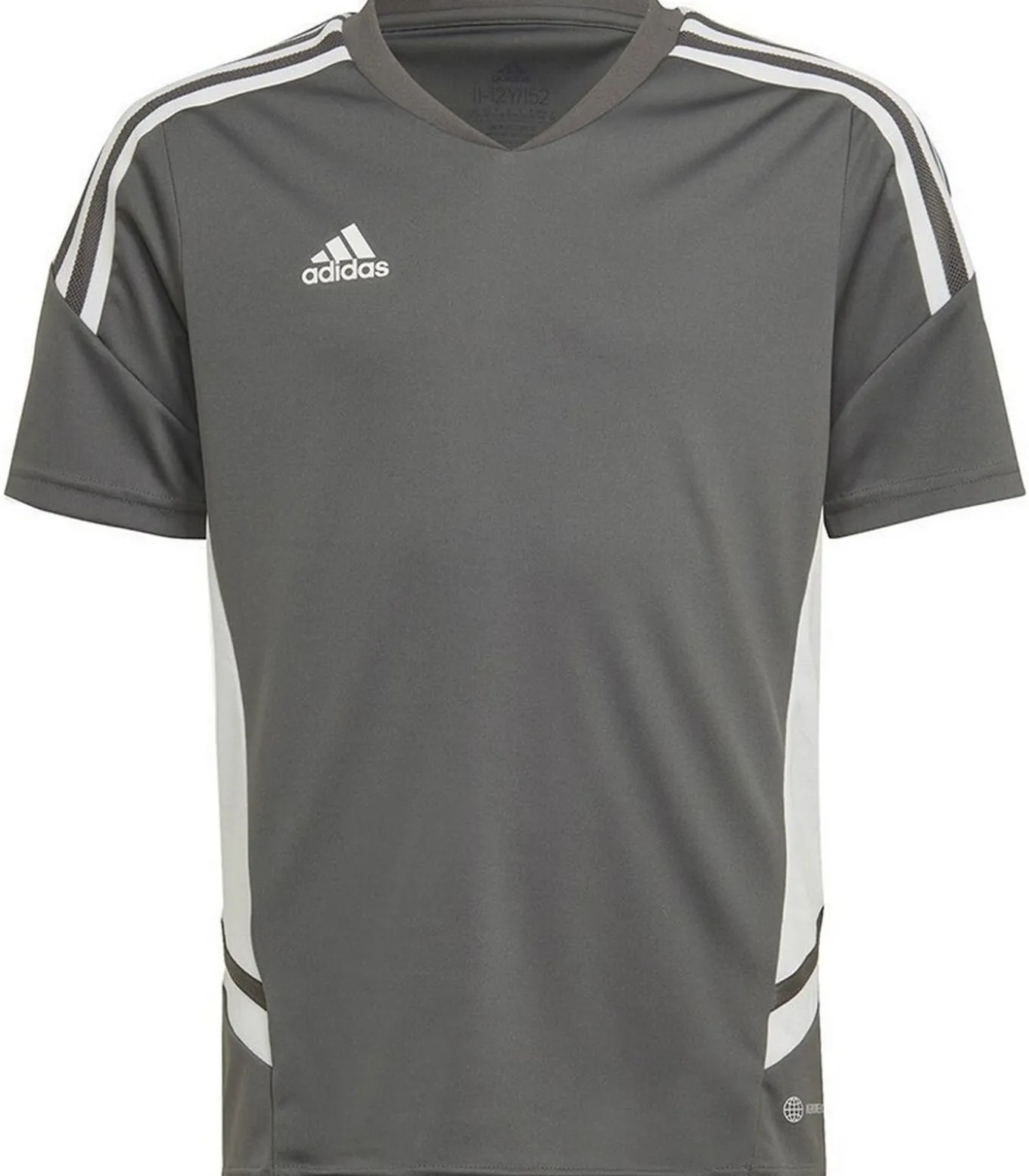 Adidas Condivo 22– Jersey – Grijs is een duurzaam product gemaakt van 100% hergebruikte polyester. Het ontwerp kenmerkt zich door een contraststreep en het logo van de merknaam. Dit model heeft korte mouwen en een V–hals. De Aeroready–technologie zorgt voor comfortabele dracht. Er is ook geperforeerd detail toegepast. Het product is aangepast aan verschillende lengtes: 6 jaar (24 inch), 8 jaar (25 inch), 10 jaar (28 inch), 12 jaar (30,5 inch), en 14 jaar (34 inch).