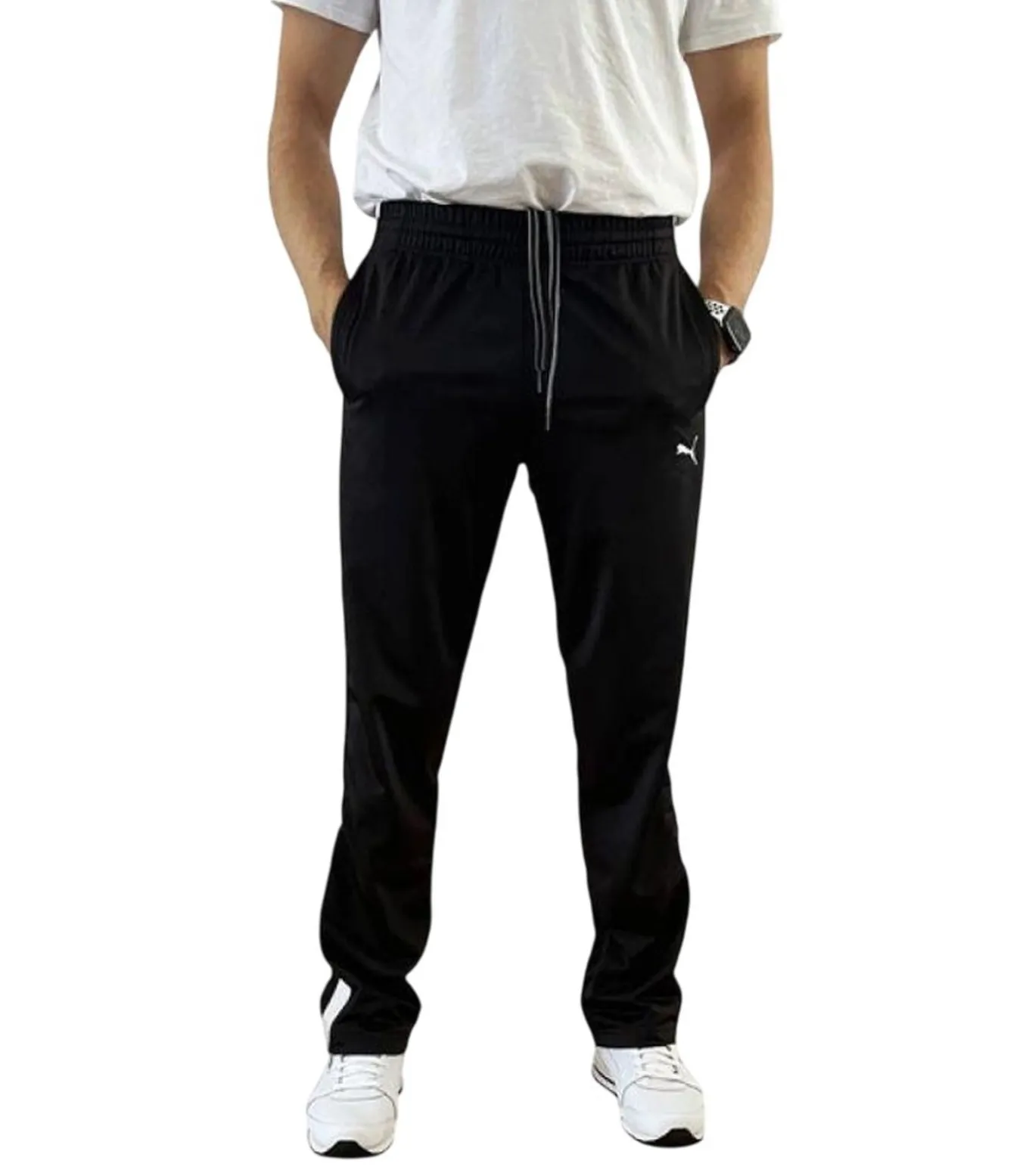 Puma–merk joggingbroek met contraststrook in zwart, gemaakt van 100% polyester. Het ontwerp kenmerkt zich door een contraststreep en het bekende Puma–logo. Het broek biedt plaats voor twee zijzakken. Translation: Puma black jogging pants with a contrast strip, made of 100% polyester. The design features a contrast strip and the famous Puma logo. The pants have two side pockets.
