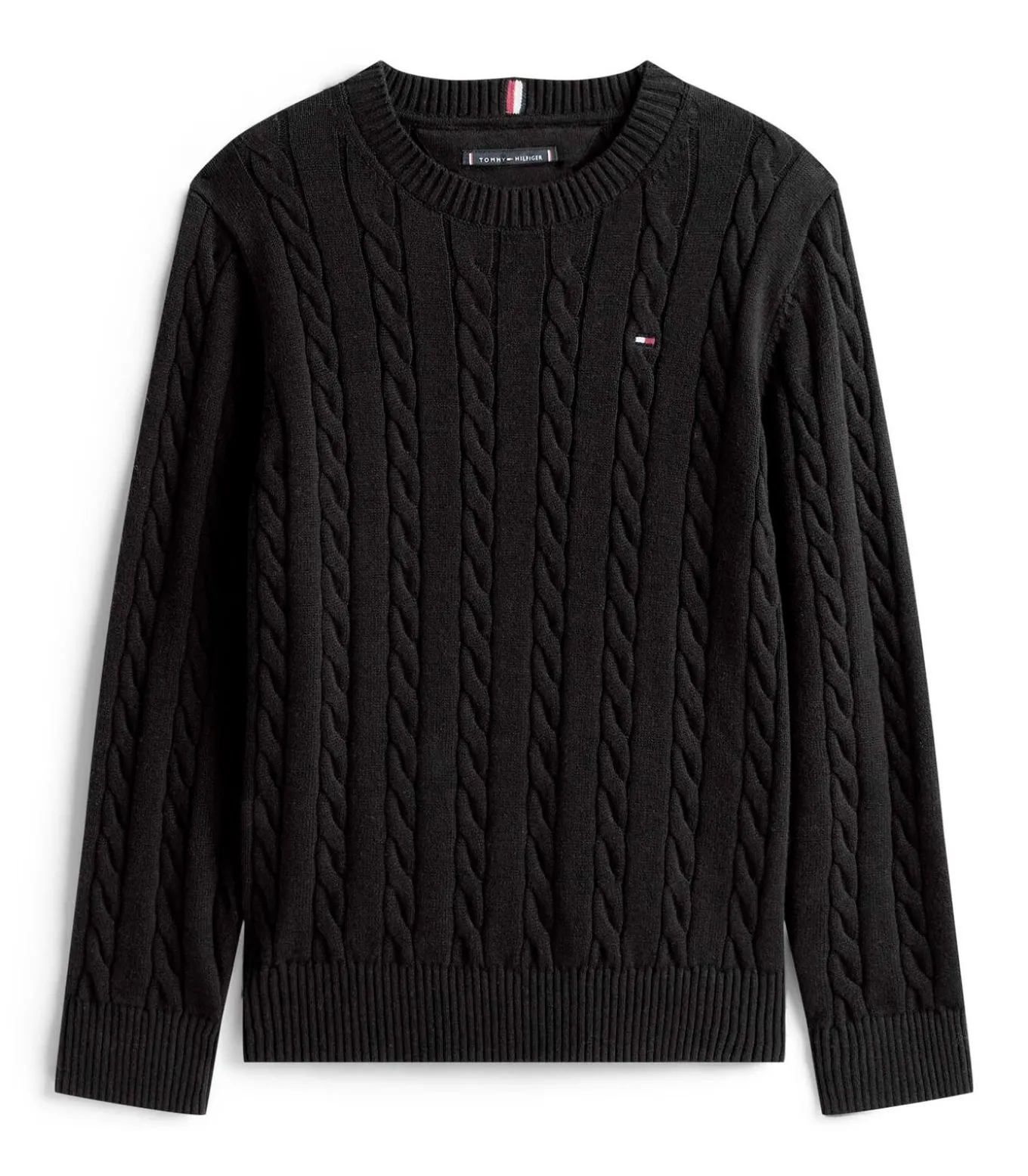 Kleur: zwart. Samenstelling: 100% biologisch katoen. Mouwen: lang. Halslijn: ronde hals. Pasvorm: regular fit. Details: geweven breisel, geribbelde kraag, manchetten en zoom, kenmerkende tape in de nek, geborduurde Tommy Hilfiger–vlag op de borst. Duurzaamheid: gemaakt van gecertificeerd biologisch katoen. Gebruik: ideaal voor school en vrije tijd, perfect voor casual maar verfijnde looks.