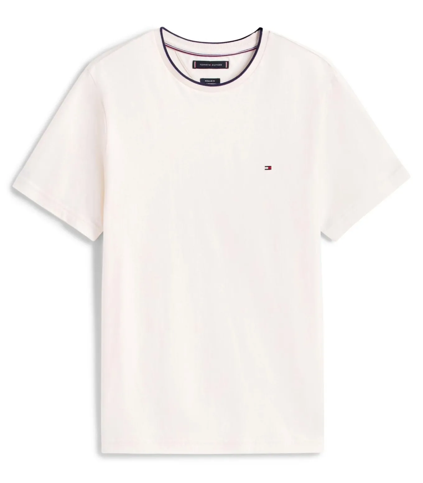 Kleur: Ivory Petal. Samenstelling: 60% modal, 40% katoen. Mouwen: Kort. Halslijn: Ronde hals. Pasvorm: Regular Fit. Details: Contrasterende streep langs de halslijn, kenmerkende tape in de nek, geborduurde Tommy Hilfiger–vlag op de borst. Duurzaamheid: Gemaakt met modalvezels uit hernieuwbare en duurzaam beheerde houtbronnen. Gebruik: Perfect voor praktische en casual kleding, geschikt voor veelzijdige dagelijkse looks.