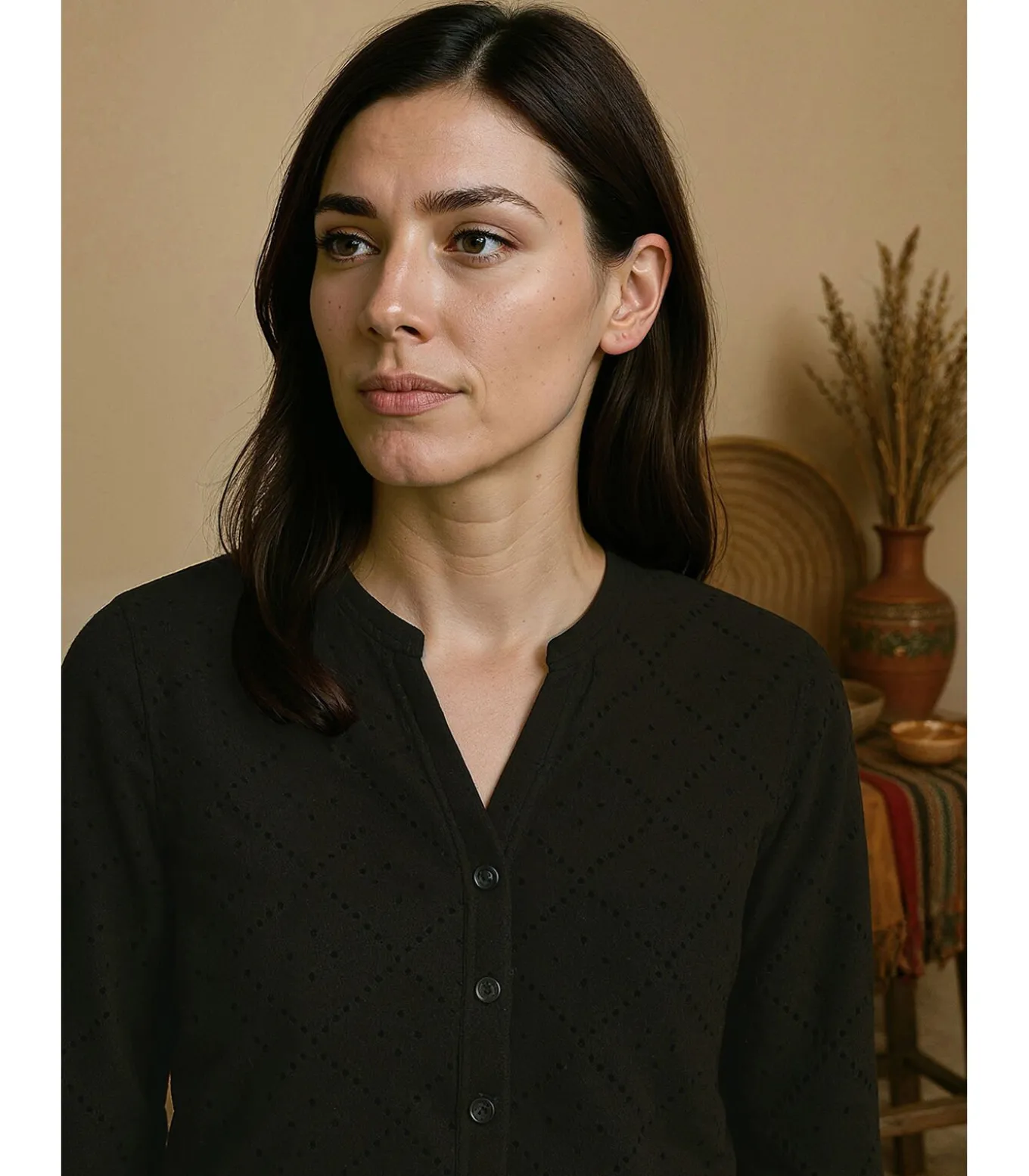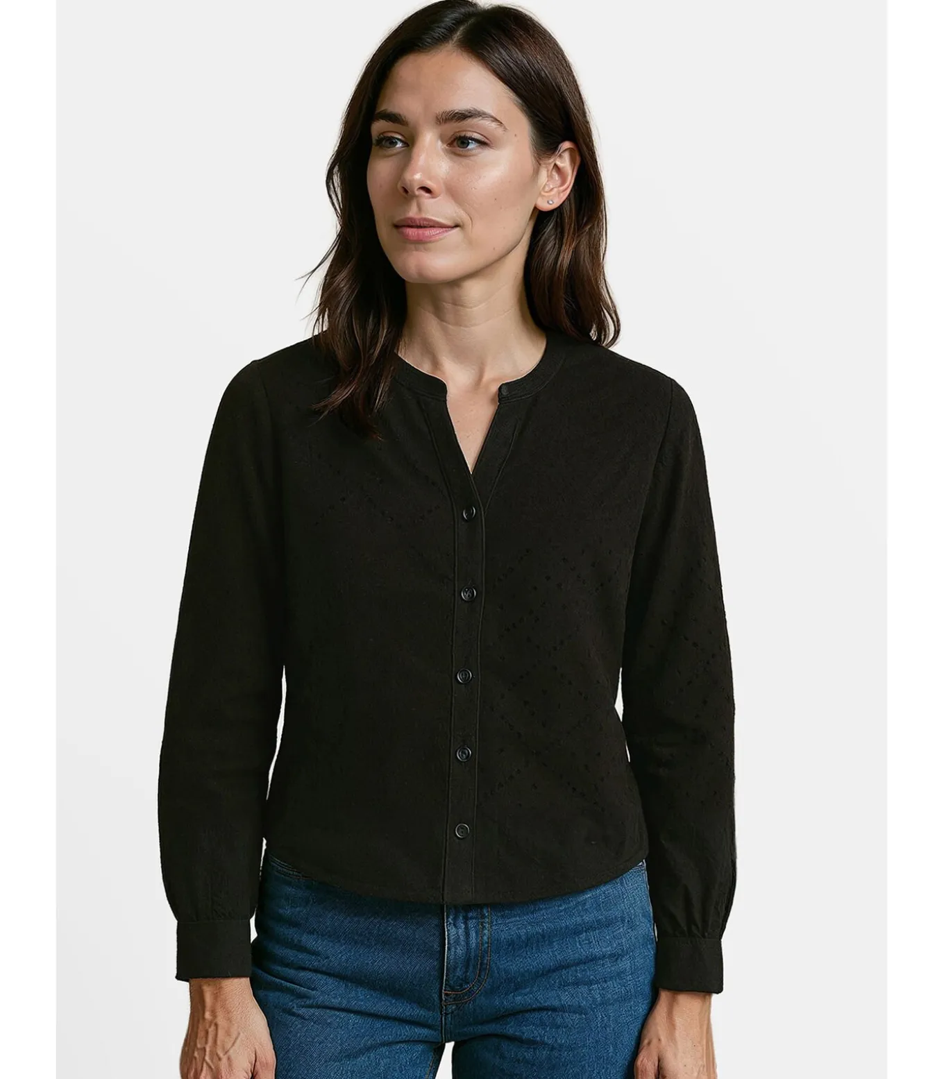 Dompel jezelf onder in de betoverende sfeer van het Andesgebergte met dit geperforeerde T–shirt met lange mouwen voor dames. Gemaakt van een mix van 50% katoen en 50% polyester, biedt dit T–shirt de perfecte mix van comfort en stijl. De losse pasvorm en opstaande kraag voegen een vleugje casual elegantie toe, terwijl de klassieke knoopsluiting en lange mouwen met oprollusjes veelzijdigheid bieden. De manchetten met knopen, subtiel borduurwerk en het J&JOY–logo rechtsonder geven dit T–shirt verfijnde details. Verkrijgbaar in blauw, is dit T–shirt een must–have voor een casual–chique outfit. Bestel het nu en voeg een vleugje verfijning toe aan je garderobe.