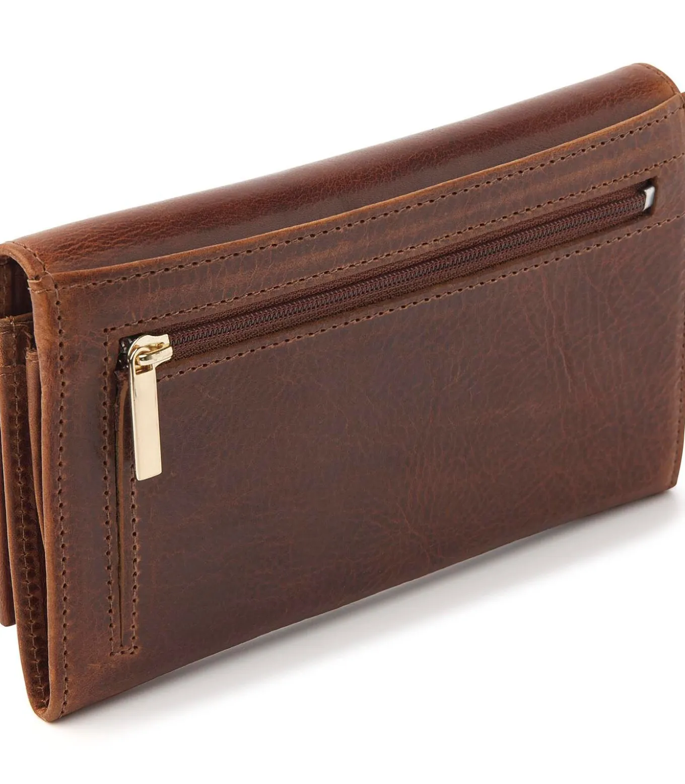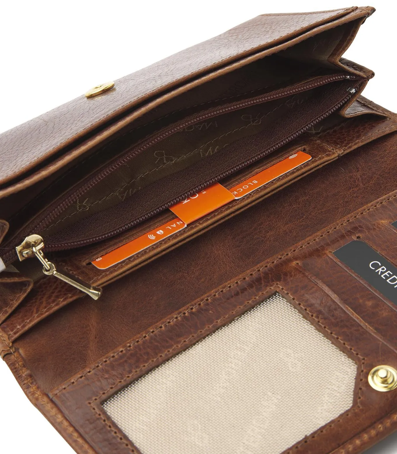 Deze klassieke damesportemonnee is gemaakt van rundleder. Het is een ruime portemonnee met plaats van acht creditcards en een extra creditcard of fotovak met gaas. De portemonnee wordt afgesloten met een drukknop, heeft twee vakken voor papiergeld, drie steekvakken en een ritsvakje. De achterzijde heeft een steekvak en een ritsvak. De portemonnee beschikt over RFID bescherming.