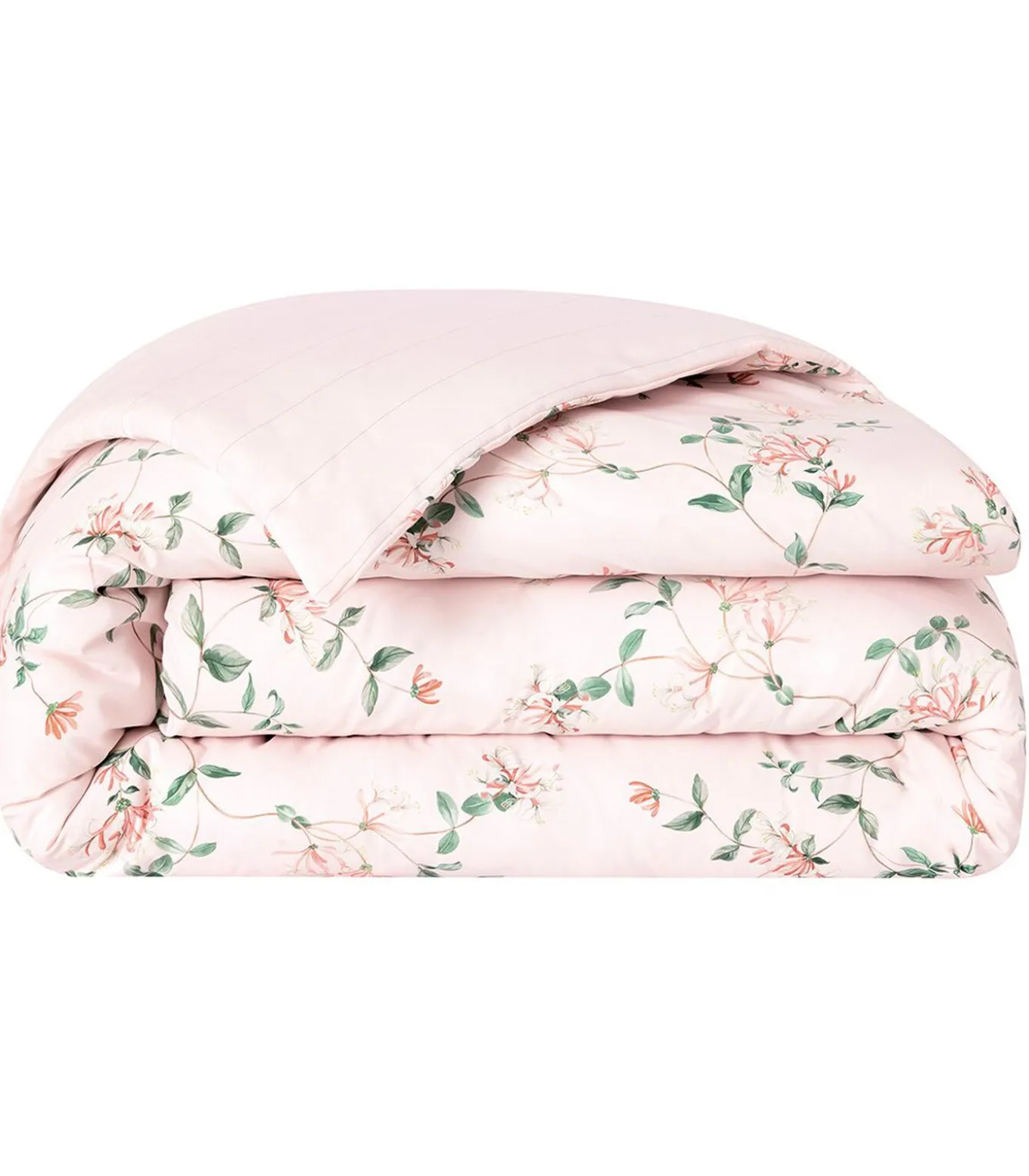 Print van kamperfoelie bloemen op poederroze achtergrondPrint van fijne verticale strepen op poederroze achtergrond
