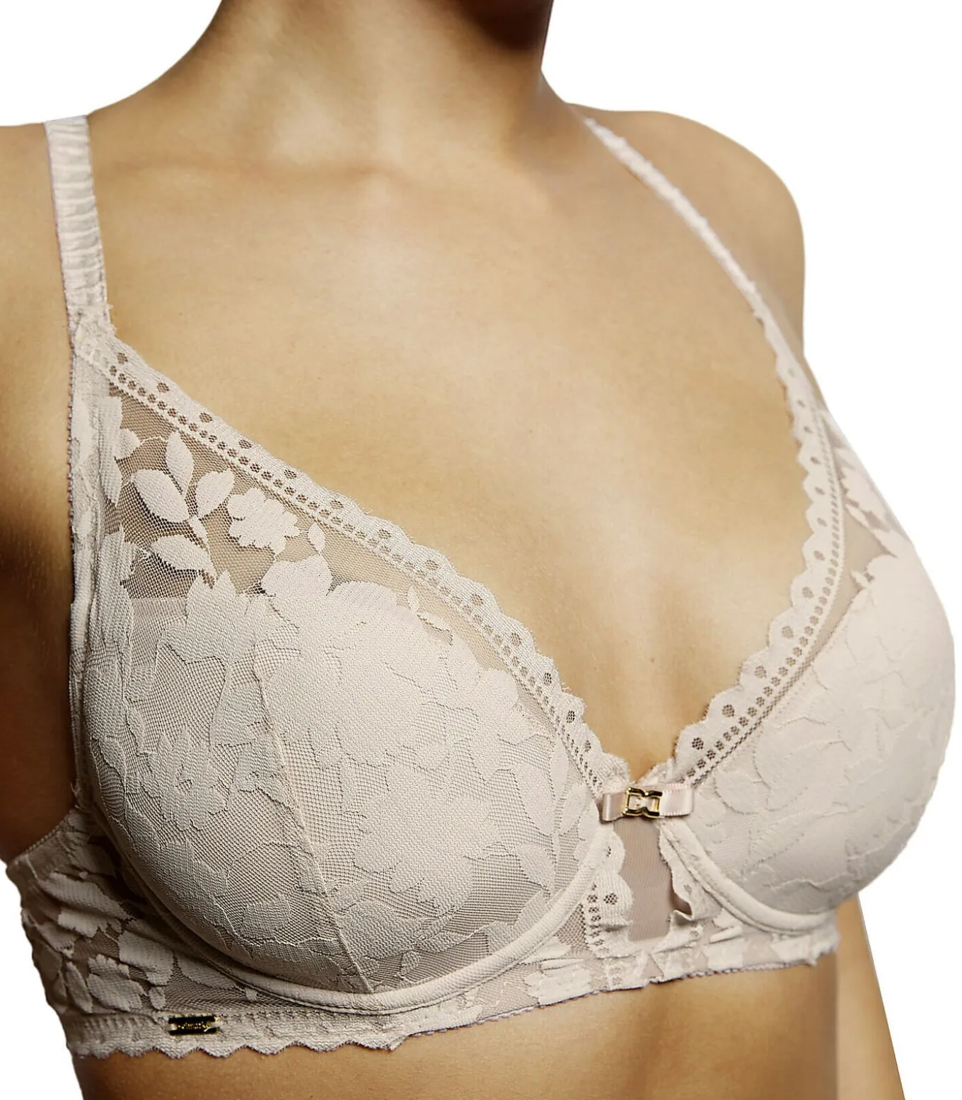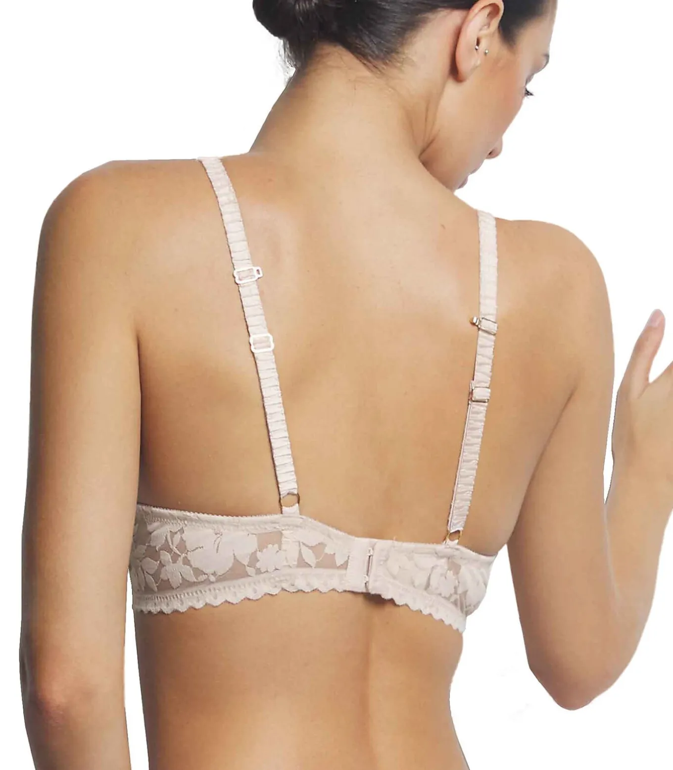 bh in een modieus model speciaal ontworpen voor diepe decolletés. De voorgevormde cups centreren de buste met een push–up effect zonder kunstgrepen. Gemaakt met delicate kanten details, met een mooi juweeltje aan de voorkant voor een romantische touch. Klein logo aan de zijkant. De dunne bandjes zijn verstelbaar voor een perfecte pasvorm en met een haakje kun je ze aan de achterkant kruisen. Dit kledingstuk is een belofte van speciale momenten, een vleugje mysterie en verleiding dat de kracht van vrouwelijkheid transformeert in haar meest verfijnde en fascinerende vorm.[Beha apart verkrijgbaar. Topje en broekje apart verkrijgbaar. Kousen en andere accessoires die het model op de foto’s draagt, zijn niet inbegrepen].