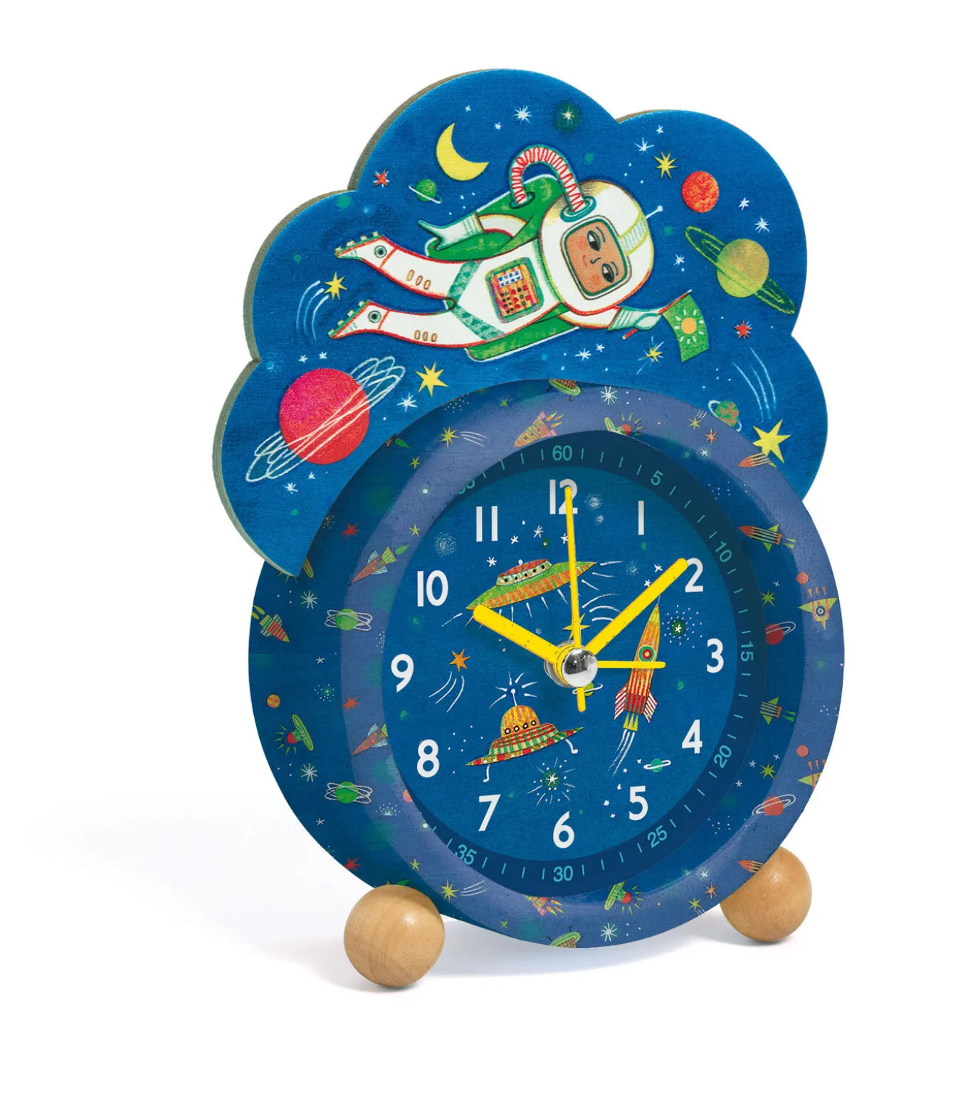 Een mooie geïllustreerde wekker met als thema de ruimte om zachtjes wakker te worden en te leren hoe laat het is. De wijzers geven de uren, minuten en seconden aan met een stil kwartsuurwerk en dankzij de lichtknop kan het kind ook in het donker de tijd zien. Een prachtig decoratief object waarmee je kind de klok leert lezen.Werkt op 1 LR6 batterij (niet meegeleverd).Inhoud: 1 houten en metalen wekker en 1 set instructies.2 jaar garantie.”Licht”–toets om de tijd in het donker te zien.Stille wijzers.Lees de tijd af met de wijzers.Standaard ringtone.Knop voor het instellen van de uren en minuten.Knop voor het instellen van het alarm.Knop voor het uitzetten van het alarm.