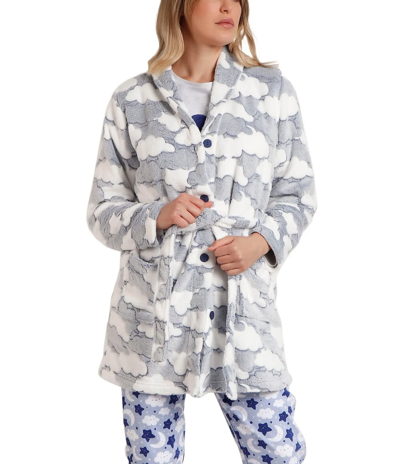 Zeer warme badjas van Corel fleece, met all–over wolkenpatroon. Hij heeft lange mouwen en praktische steekzakken. Hij kan dicht worden gedragen dankzij een ceintuur die in de taille kan worden geknoopt en een knoopsluiting aan de voorkant. Ultrazacht en comfortabel, perfect voor winteravonden of ontspannen dagen thuis.[Jurk wordt apart verkocht. De pyjama die het model op de foto’s draagt, is niet inbegrepen].