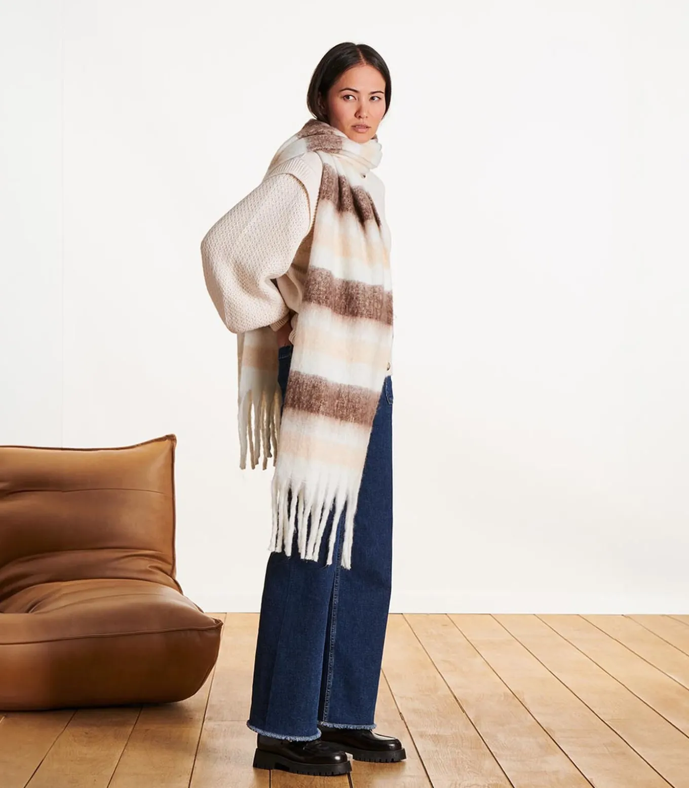 – Ecru sjaal met brede strepen