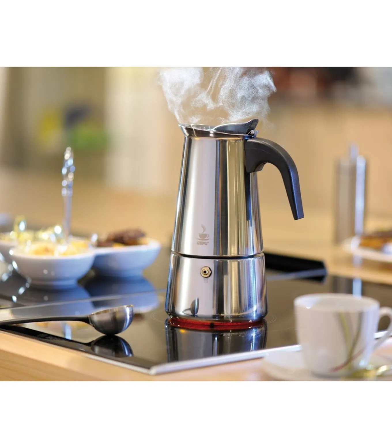 • Voor het zetten van verse espresso• Geschikt voor elektrische –, gas–, inductie– en glas–kookplaten• Uitgiettuit