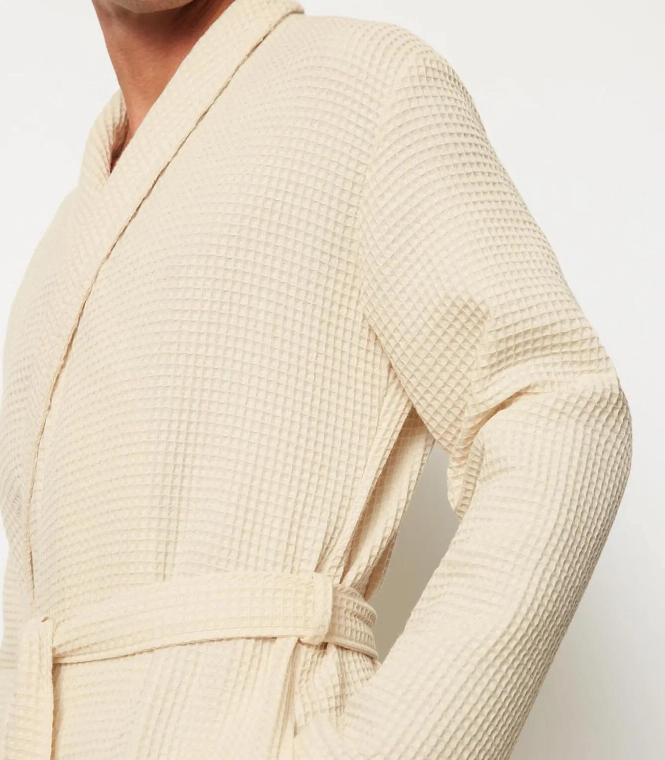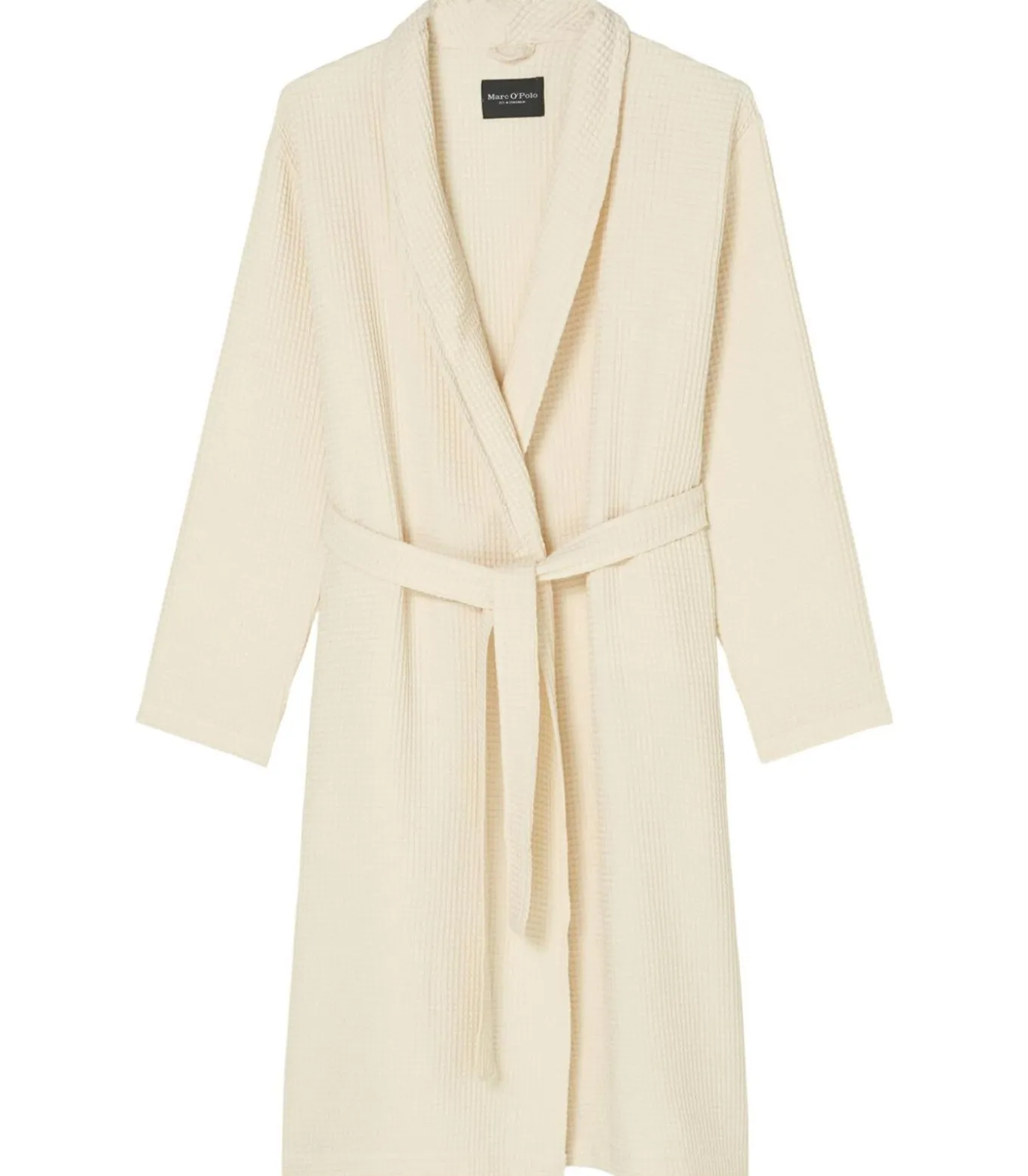 Contemporary Comfortable. Lichtgewicht badjas van GOTS–gecertificeerd biologisch katoen met een fijne wafelstructuur in tijdloze kleuren. Met een wijde kimonomouw voor vrouwen en een klassieke mouw voor mannen. Voor elk seizoen en elk moment.