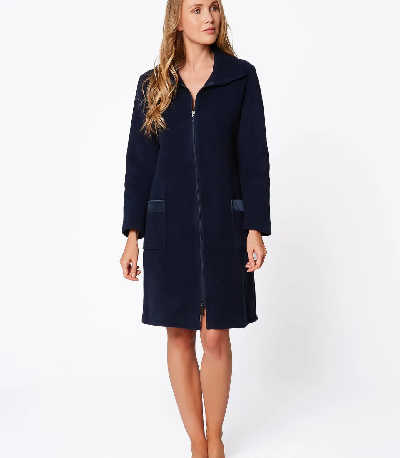 Een kamerjas met rits, lengte 95 cm , rechte snit, van 100% polyester, marinefleece. Twee grote opgestikte zakken, aangevuld met een applicatie van marineblauw satijn bovenaan de zak. Het essentiële voor de winter.