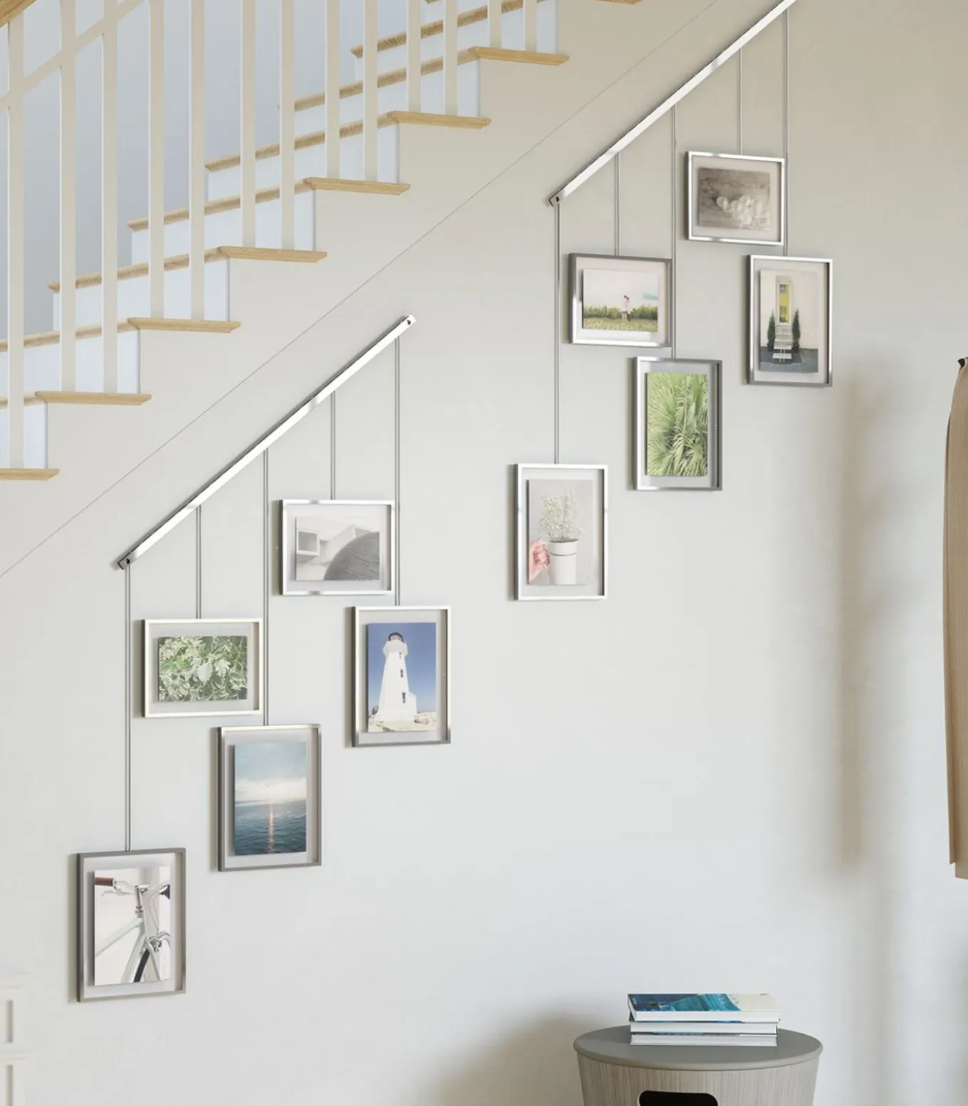 Exhibit bestaat uit een metalen staaf die aan de muur wordt gemonteerd, waaraan dan met clips en beugels vijf fotolijsten worden opgehangen. Dat betekent minder boren, en dus minder schade aan de muur. De beugels met de fotolijsten hangen aan de staaf en kunnen helemaal naar wens verschoven worden. Exhibit is erg flexibel en kan ook perfect schuin boven de trap worden opgehangen. Gebruik Exhibit om moderne accenten aan te brengen in je woonkamer, slaapkamer, hal, kantoor of studio. Geef je favoriete foto’s en kunstwerken het plekje dat ze verdienen. Exhibit is helemaal aanpasbaar aan je eigen ideeën. De fotolijsten kunnen langs de metalen staaf worden verschoven en worden gedraaid voor liggende en staande foto’s. Exhibit wordt geleverd met twee lijsten van 10 x 15 en drie van 13 x 18 cm voor al je favoriete foto’s, kunstwerken, illustraties en meer. Exhibit past naadloos in verschillende woonstijlen en maakt het makkelijk om foto’s en kunstwerken te vervangen en zo de kamer een heel nieuwe look te bezorgen. Europees ontwerpnummer 008159107–0001