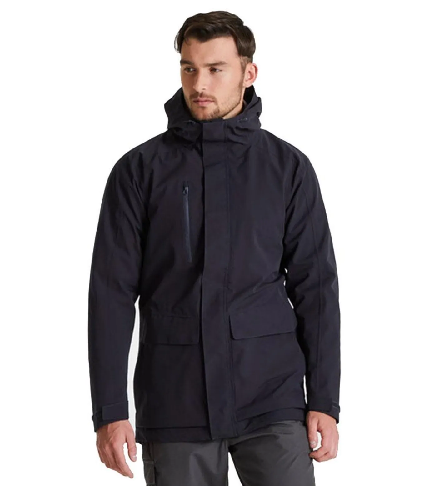Craghoppers EXPERT KIWI PRO Zwarte Jacket, gemaakt van 100% polyester reukweerbaar stof en voorzien van Aqua Dry, Ademend, DWR Finish en EcoShield technologieën. Het ontwerp is voorzien van het Craghoppers logo en bevat PFC–vrij reflecterende details. De halslijn is kapitein en het heeft lange mouwen. Het kapselement is verstelbaar en heeft een Grown On Hood. Het jacktje meet lengte, en de zijzakken zijn voorzien van ritsen. Het heeft een volledige sluitrij met stormlap en stud. Het jacktje heeft een waterdichtheid van 20.000g/m²/24hrs en een waterdichte classificatie van 10.000mm, waardoor het geschikt is voor regenachtige omstandigheden. Het is gemaakt van hergebruikte materiaal en heeft een XS tot 3XL grootte.