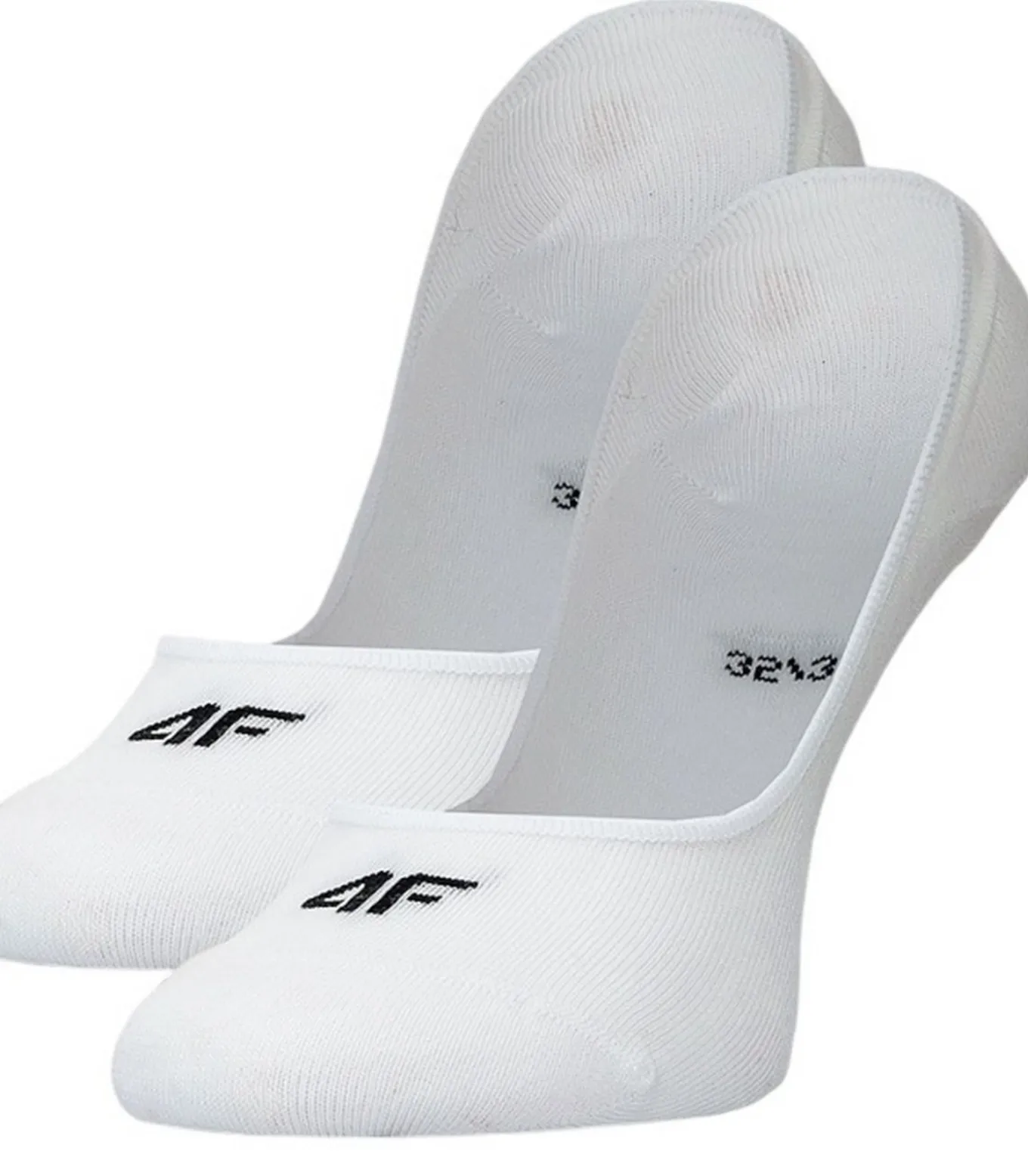 Kledingartikel 4F, F472 – Sokken in wit, gemaakt van 69% katoen, 28% polyamide en 3% elastane. De stof is gebreid en gewoven. Het ontwerp bevat eenvoudig een logo. Het voert antislip en heeft een vlakke teennaad. Het is laag gesneden.