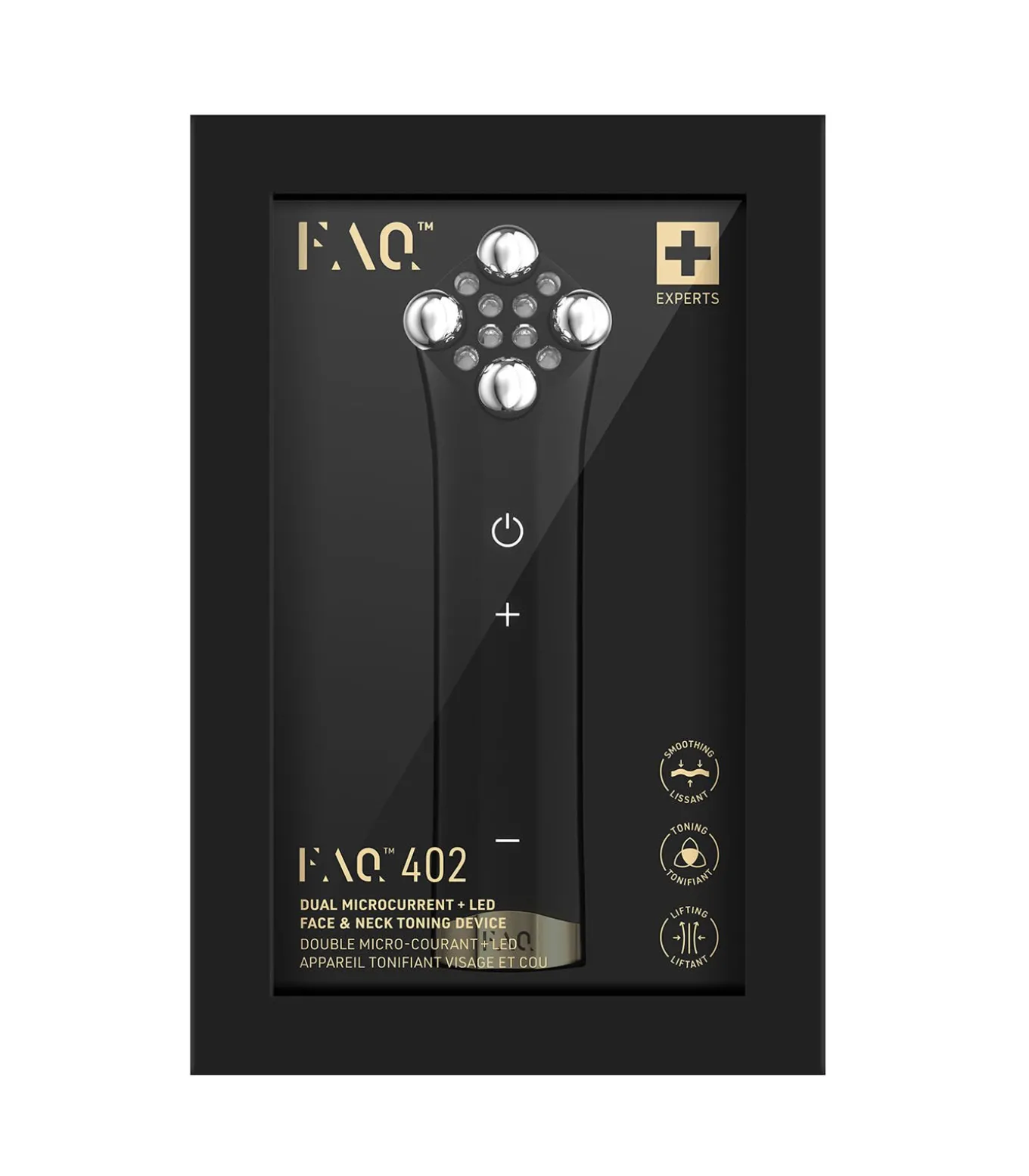 WAAR WETENSCHAP DE HUID ONTMOET’s Werelds eerste anti–aging apparaat met dubbele microcurrent, NIR en rood lichttherapie. FAQ™ 402 gaat verder dan het oppervlak – het herstelt meerdere huidlagen en diepe weefsels terwijl het de spieren eronder versterkt. Het verzacht diepe rimpels en fijne lijntjes, vermindert ouderdomsvlekken, definieert de kaaklijn en bestrijdt langdurige verzakking. Het resultaat? Een huid die er gelift, gecontourd en voller uitziet. Dat klopt. We hebben zojuist de beste verouderings hack gevonden.Lift & contourtDubbele microcurrent stimuleert en versterkt de 69 gezichts– en nekspieren, lift en definieert de jukbeenderen, kin en kaaklijn voor een natuurlijk jeugdige, gecontourde look.Verstevigt & verstevigtNIR en rood LED–licht stimuleren collageen, verstevigen de huid, verzachten fijne lijntjes en verstevigen verzakte gebieden voor een jeugdiger uiterlijk.Egaliseert de huidtint & textuurBlauwe LED richt zich op ouderdomsvlekken, ongelijkmatige textuur en roodheid, verzacht en geneest de huid voor een egalere teint.Brengt huidverzorging dieper inElectroporatie opent de huid voorzichtig om de absorptie van huidverzorging te stimuleren, waardoor de producten sneller en effectiever werken.Versterkt de uitstraling en vermindert wallenT–Sonic™ massage stimuleert microcirculatie en lymfedrainage, versterkt de uitstraling en vermindert wallen.Innovatieve AIAI–aangedreven microcurrent past de intensiteit in real–time aan om de behandeling voor elk gebied van je gezicht te optimaliseren.