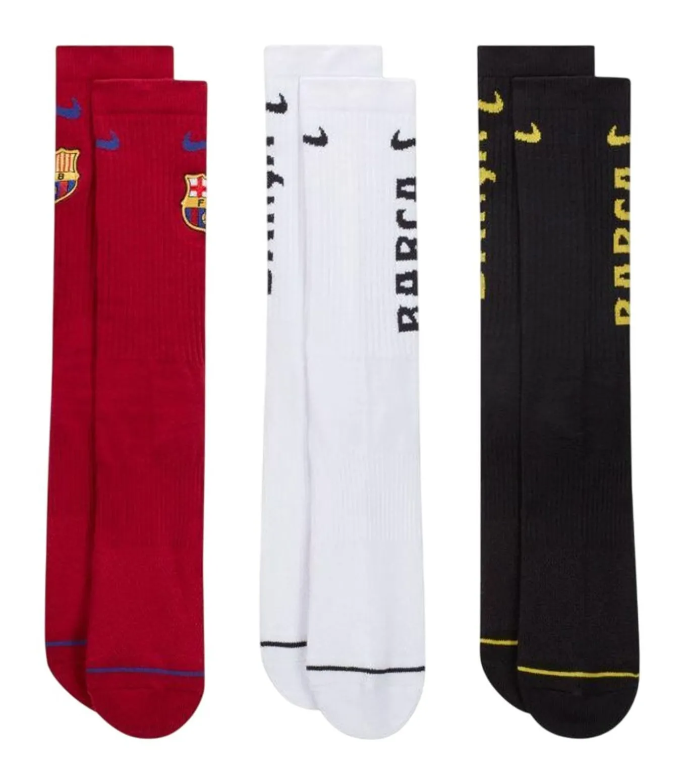Nike FC BARCELONA witte sokken met ontwerp van de kuif en Swoosh–logo. Deze sokken zijn gemaakt van 60% katoen, 20% polyester, 15% nylon en 5% elastaan. Ze gebruiken Adaptivatechnologie, Dri–FIT voor droogteabsorptie en duurzaamheid. Deze sokken zijn gesmolten en 100% officieel glicentieerd door FC BARCELONA. Verder zijn er versterkingen aan de hiel en teen toegepast.