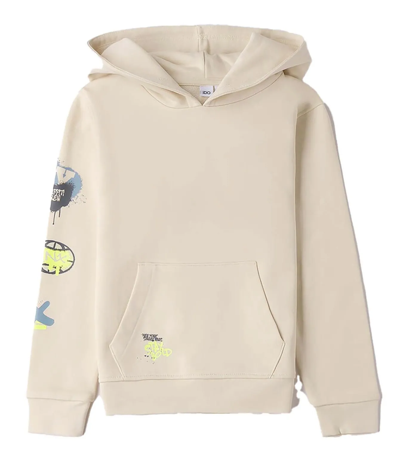 Kleur: ecru Samenstelling: 100% katoen Mouwen: lang Halslijn: capuchon Details: Jongenstrui van 8–16 jaar van herfstachtig katoen, met capuchon, kangoeroezak en kleurrijke print op de voor– en achterkant. Oversized pasvorm voor een moderne en comfortabele look. Gebruik: ideaal voor school en vrije tijd, perfect voor wie houdt van een casual en eigentijdse stijl.