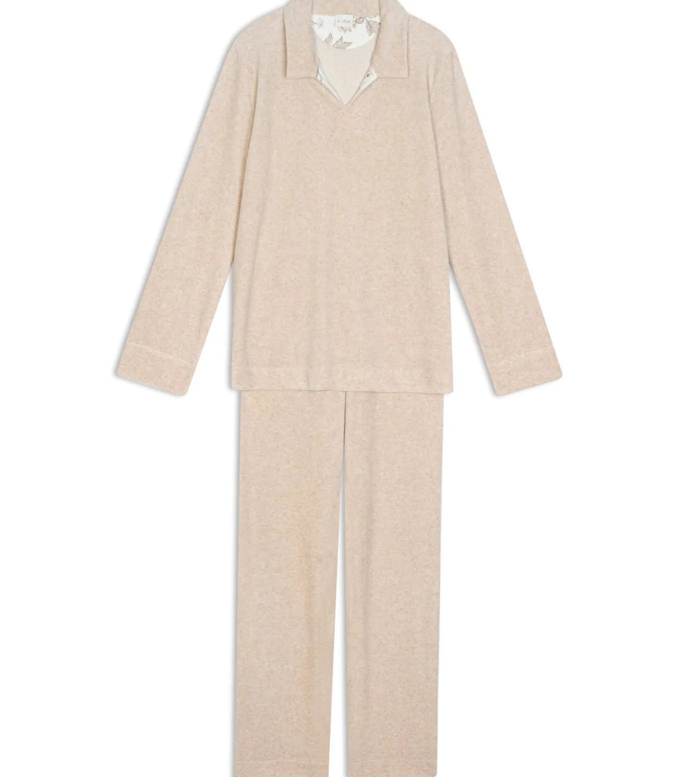 In het gemêleerde beige fluweel heeft dit item een ??vleugje van de kenmerkende bloemenprint van de Kelly–lijn. Je kunt de mouwen oprollen om manchetten te creëren en spelen met verschillende materialen. Voor degenen die gevoeliger zijn voor kou, combineer de set met een kamerjas, badjas of Essentiel–jas.