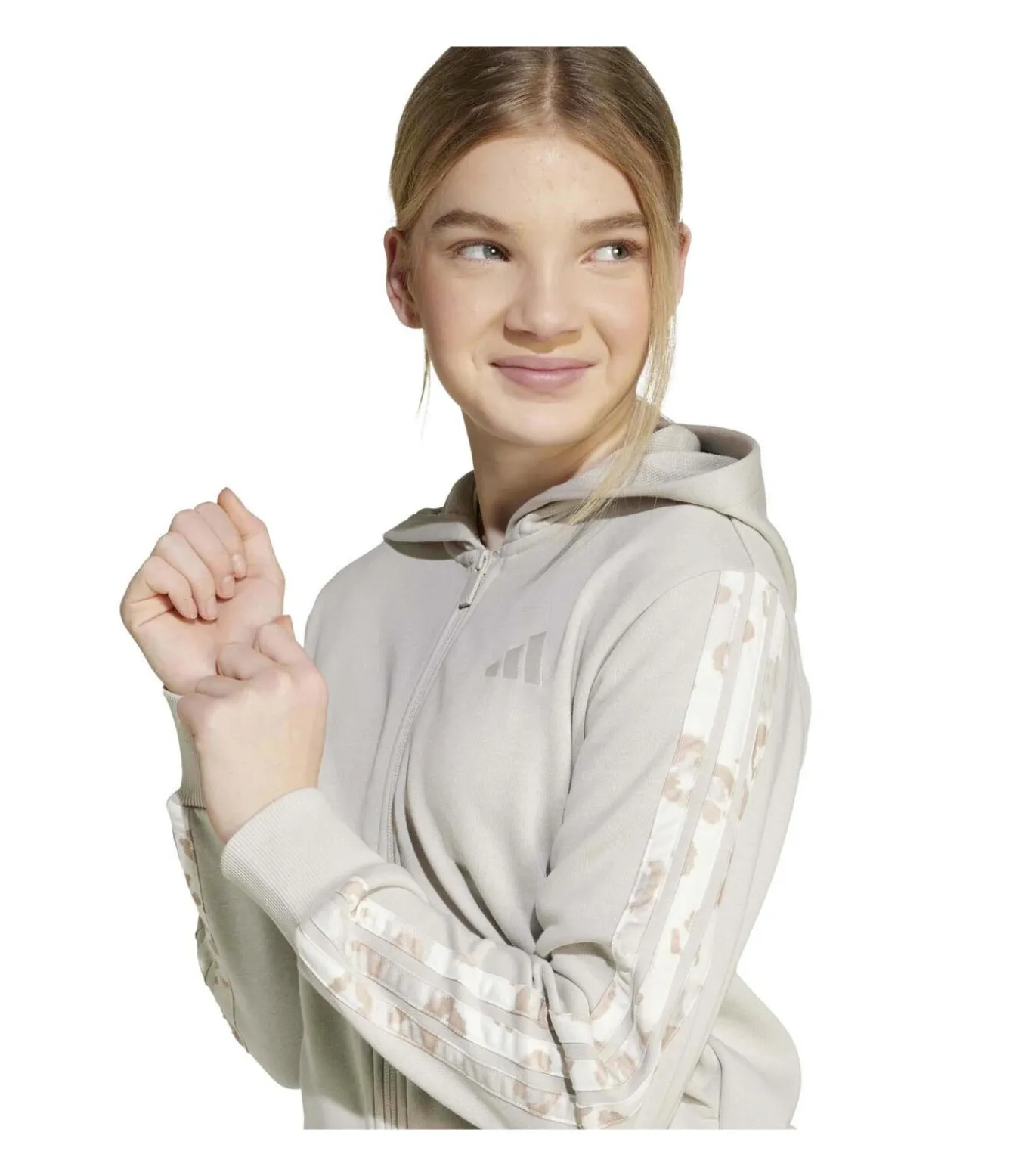 Kleur: Wonalu Samenstelling: 55% katoen, 36% gerecycled polyester, 9% viscose Mouwen: lang Halslijn: capuchon Pasvorm: normale pasvorm Sluiting: ritssluiting aan de voorkant Details: katoenen French terry–stof, 3 strepen met dierenprint voor een speelse touch Gebruik: juniorjack, ideaal voor school, vrije tijd en dagelijkse activiteiten