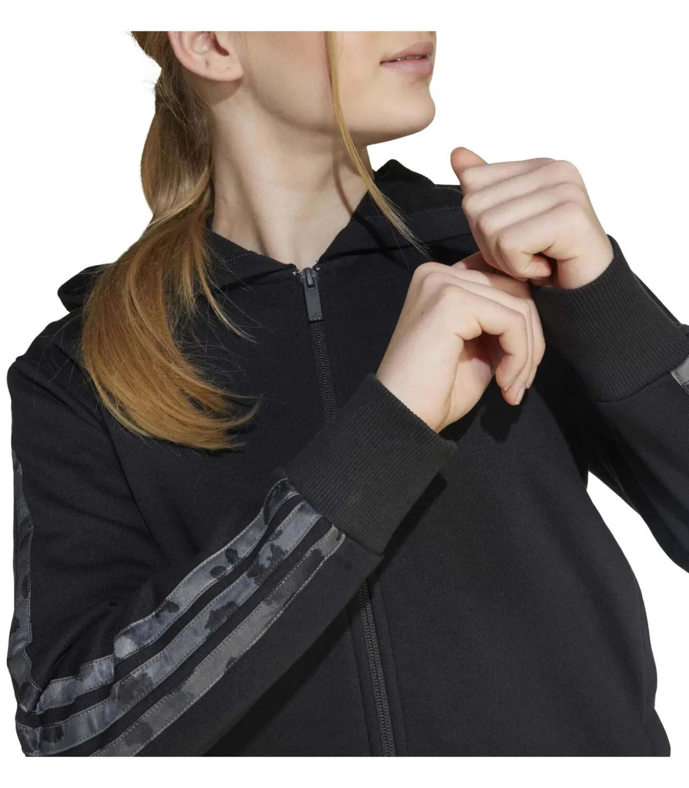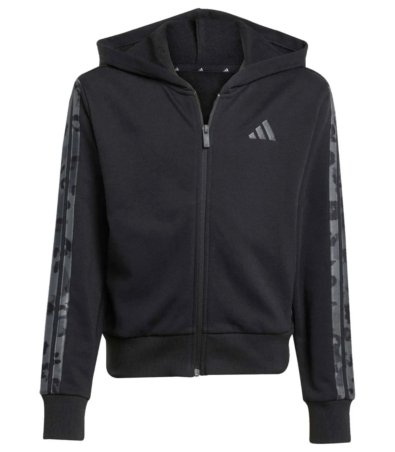 Kleur: zwart. Samenstelling: 55% katoen, 36% gerecycled polyester, 9% viscose. Mouwen: lang. Halslijn: capuchon. Pasvorm: regular fit. Sluiting: rits aan de voorkant. Details: French terry stof van katoenmix, 3–strepen met dierenprint voor een speelse touch. Gebruik: juniorjas, ideaal voor school, vrije tijd en dagelijkse activiteiten.