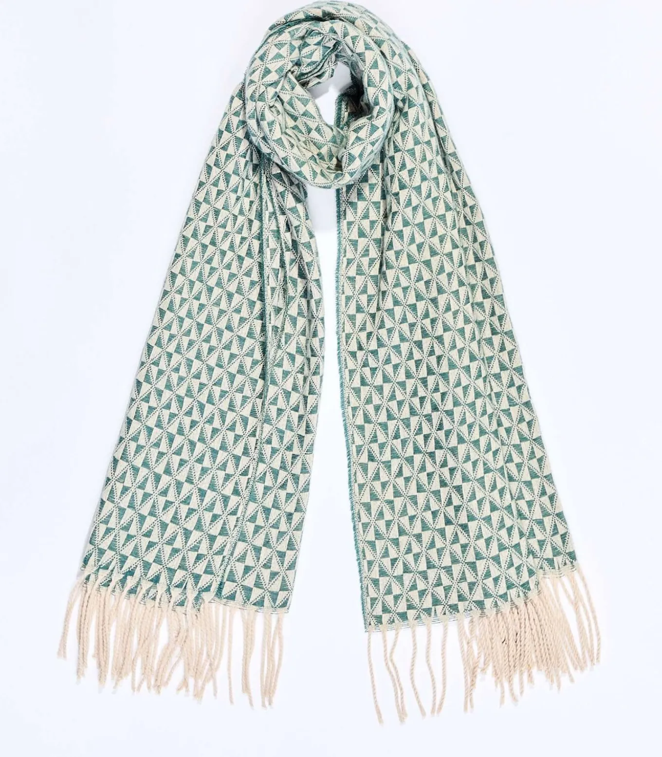 Ongeëvenaarde zachtheid en warmte met deze grote, ultracomfortabele gebreide sjaal. Het geometrische design combineert gemakkelijk met diverse outfits en voegt een moderne toets toe aan uw look. Productdetails: rechthoekige gebreide sjaal, zacht en warm breisel, modern en elegant design, afgewerkte gevlochten franjes, afmetingen: 180 x 68 cm.